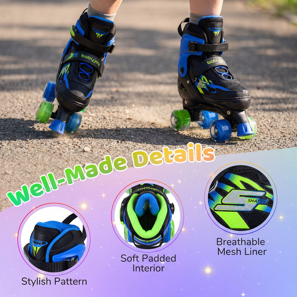 ● Eye-Catching Gift for Active Play: Featuring stylish patterns, these rollerskates are suitable for smooth indoor floors and outdoor paths. Besides, they make a thoughtful gift for birthdays, holidays, or daily surprises while encouraging speed, balance, and coordination.