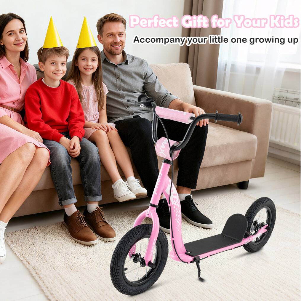 ● Large Inflatable Tires: Equipped with two 12" inflatable rubber tires which are non-slip and anti-wear, this youth scooter provides a smooth ride on a variety of surfaces, like cement road, brick road, wood floor, asphalt road and so on.