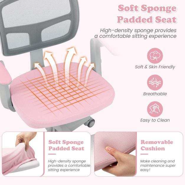 With a swivel seat and adjustable height, footrest, and armrests, this kids desk chair ensures a tailored fit for your child's changing needs. The ergonomic mesh backrest and Y-shaped lumbar support encourage a healthy sitting posture, while the soft, removable cushion adds comfort and hygiene. The stable base with smooth universal wheels ensures easy mobility, making it ideal for various activities.