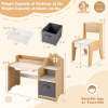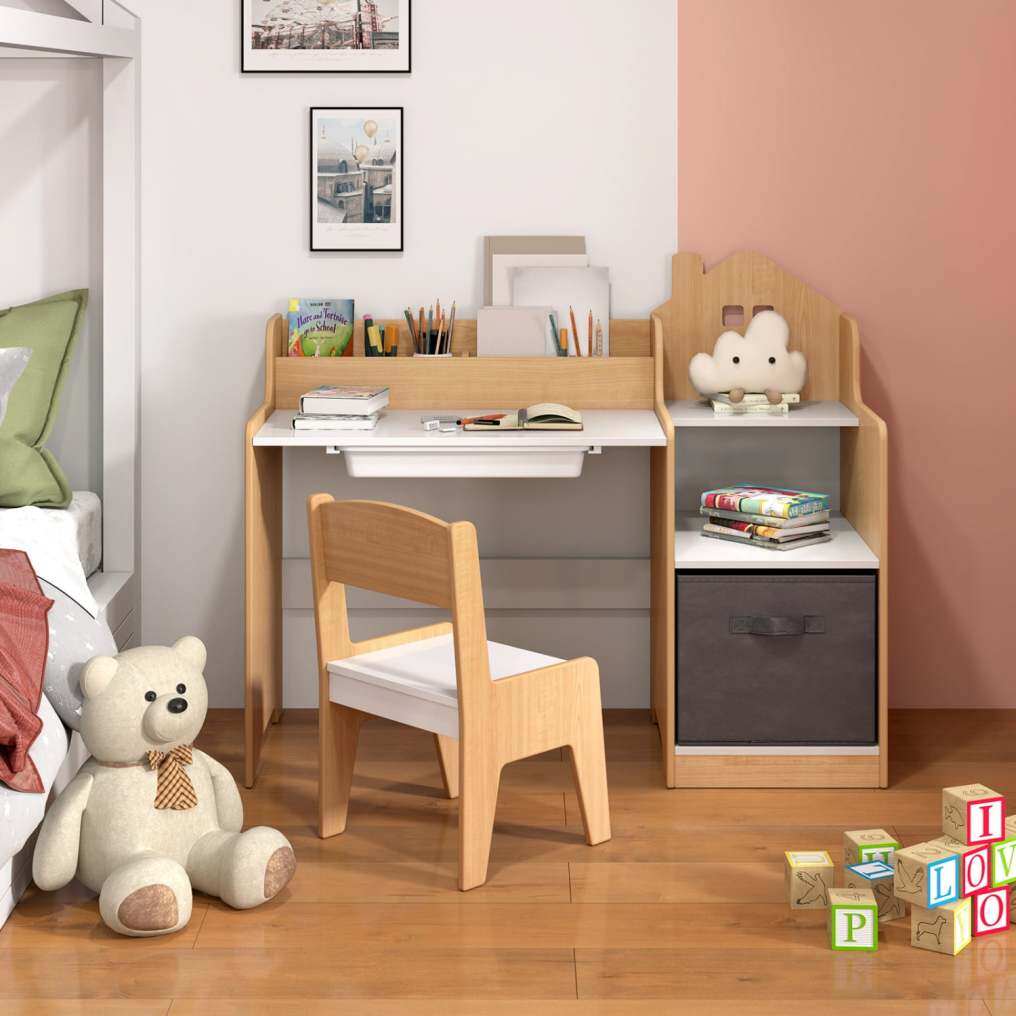 This set includes a spacious desk and an ergonomic chair, ideal for children aged 3 and up. The desk features multiple open compartments and a smooth sliding drawer, providing ample storage space. Additionally, a removable fabric storage bin is included to keep art supplies or toys organized and accessible. Featuring a slightly inclined backrest, the chair offers great support for kids and helps them cultivate good sitting posture. To enhance safety, both the study table and chair are built with round corners and smooth edges to minimize the risk of bumps and bruises.