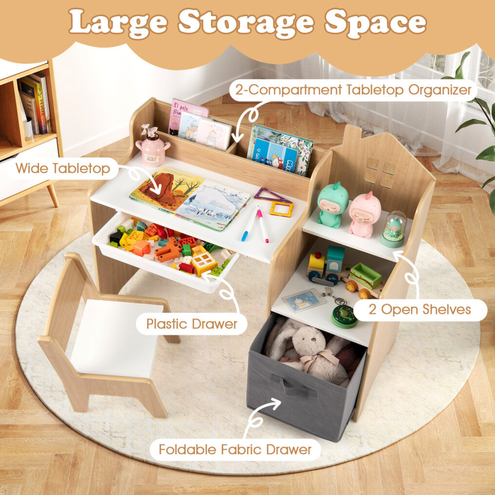 Multiple Storage Options: Equipped with a 2-compartment tabletop organizer, a wide tabletop, 2 open shelves, a plastic drawer and a foldable fabric drawer, the study table provides large storage space for children's, books, toys, art supplies and more.