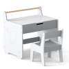The detachable tabletop switches between a whiteboard and chalkboard, inspiring various activities. Built-in storage space keeps tools and toys neatly arranged for a focused learning environment. The integrated paper roll holder allows continuous art projects. Safety is prioritized with rounded edges and sturdy structure. This desk and table set will be a great addition to your little one’s room.
