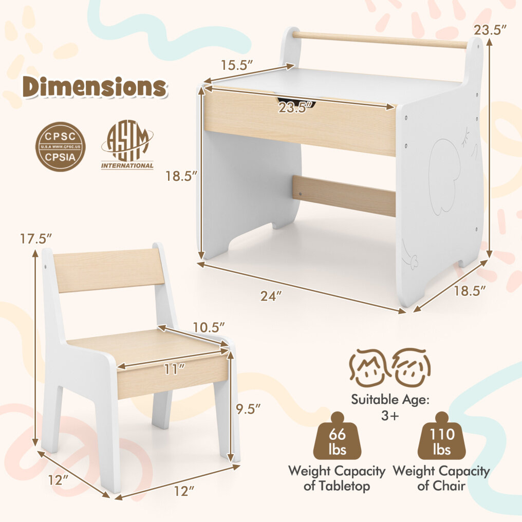 ● Child-Friendly Design: The kid-friendly sizes ensure it's suitable for children, offering a comfortable space for young minds to thrive. Table dimension: 24" x 18.5" x 23.5" (L x W x H). Chair dimension: 12" x 12" x 17.5" (L x W x H).