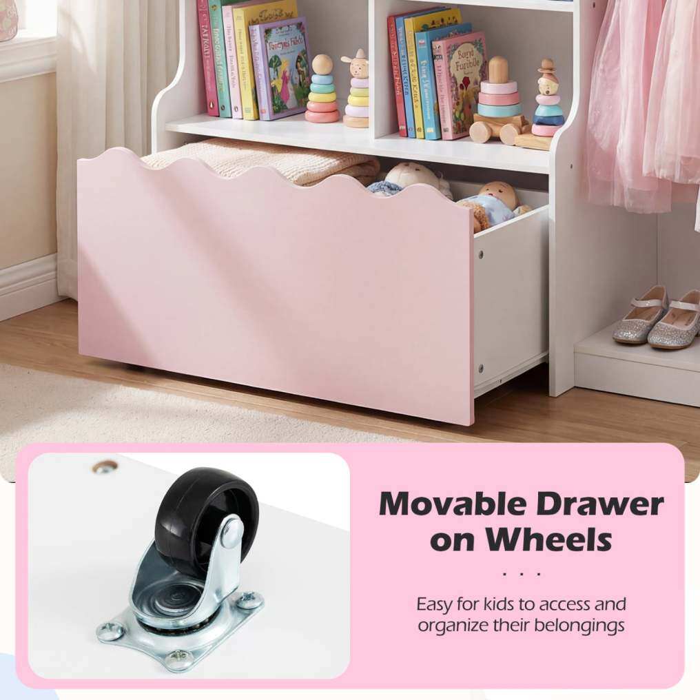 ● Movable Drawer on Wheels: Equipped with 4 universal wheels, the movable drawer provides effortless access for kids as they manage their favorite items. The easy-glide design encourages self-organization, making tidying up fun, simple, and engaging for little hands.