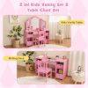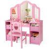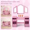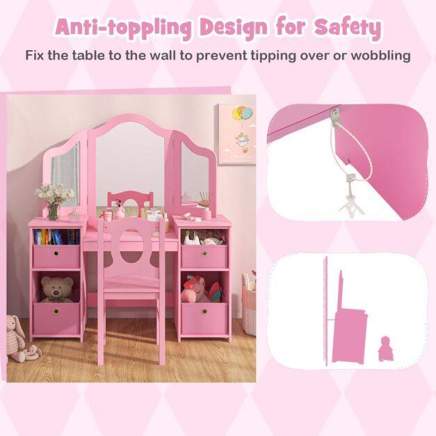 This multi-use kids table and chair set caters to activities like dressing up, reading, and drawing. Featuring ample storage with open compartments and removable bins, it keeps your child's essentials organized. The shatterproof tri-folding mirror offers safety and functionality, enhancing their grooming and play experiences. Safety is prioritized with an anti-toppling device and rounded corners for worry-free fun.