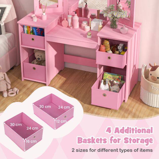 Large Storage Capacity: Equipped with a spacious tabletop, 4 open storage compartments, and 4 removable fabric bins, this kids makeup table provides plentiful storage options for all your child's necessities, including art supplies, books, or beauty products.