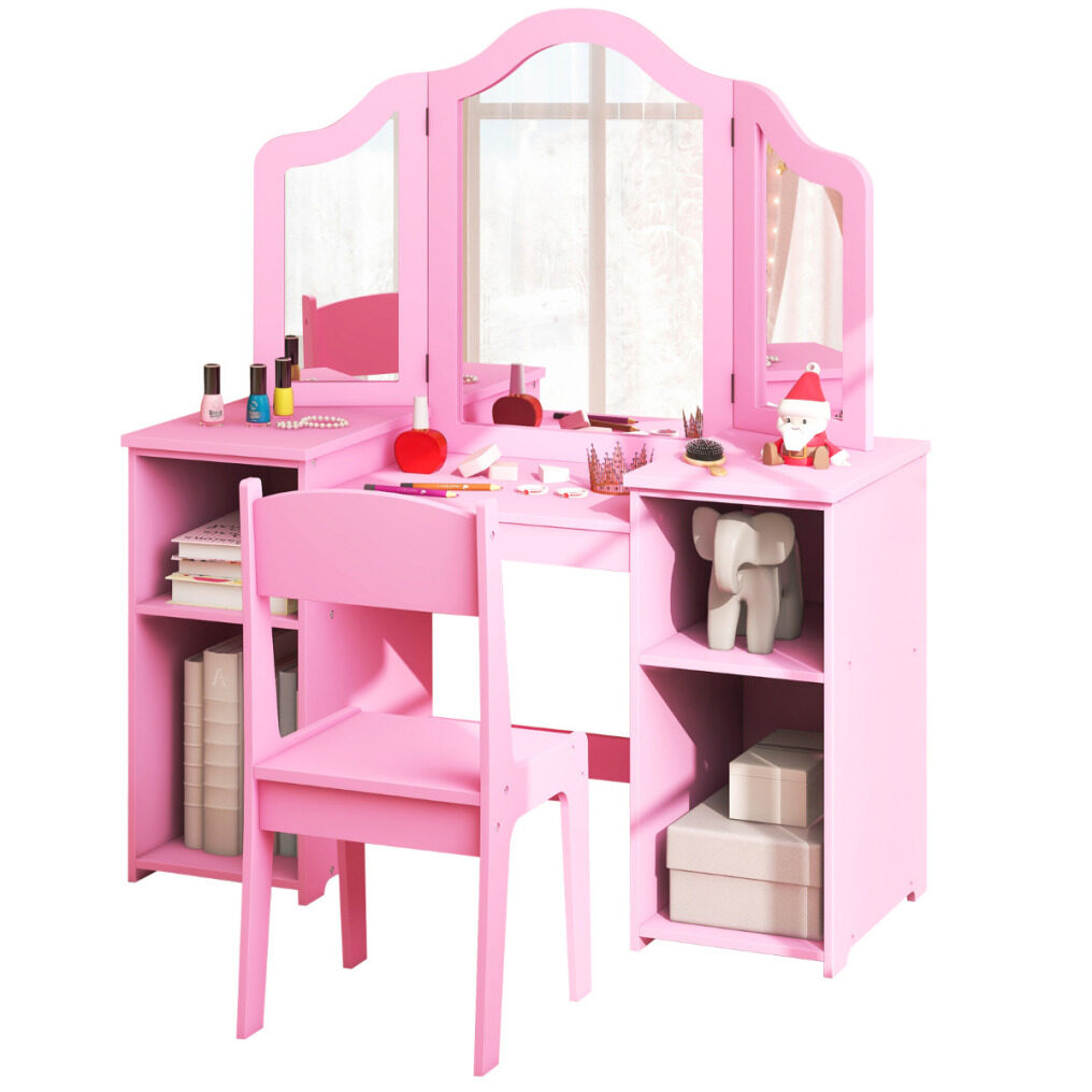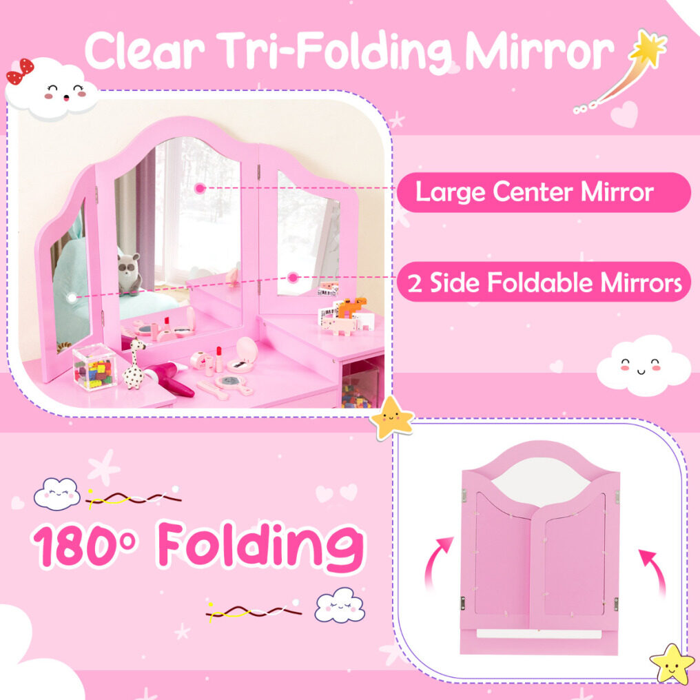 ● Perfect Gift for Little Princess: Designed with removable tri-folding mirror, this 2-in-1 kids vanity table set serves as a vanity table or a writing desk, meeting kids' different needs. With ASTM and CPSIA certification, parents can buy with confidence. Suitable age: 3+ years old.