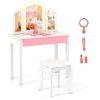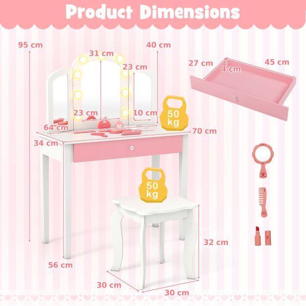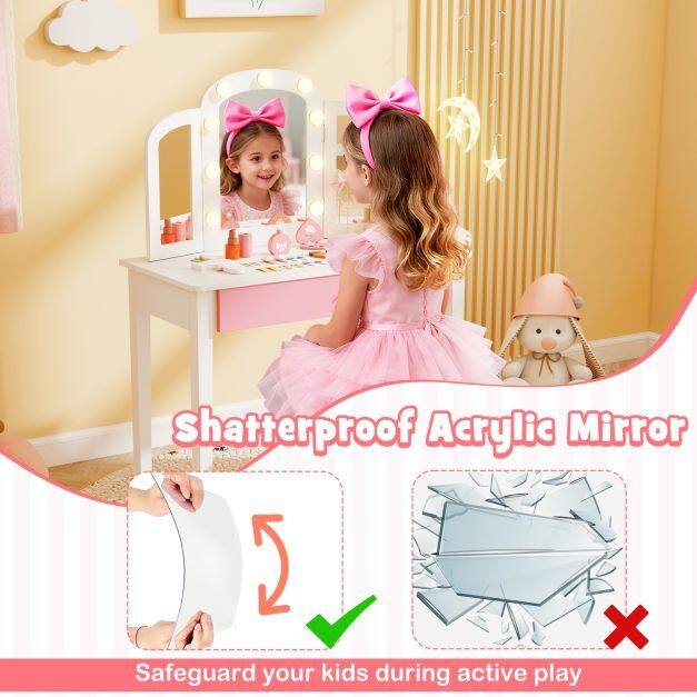 This kids vanity table offers dual functionality with a detachable mirror, allowing quick transformation into a writing desk. The shatterproof tri-fold acrylic mirror provides a wide, adjustable view. Three adjustable lighting modes make it fun and easy for children to personalize their space. Ample storage comes from a spacious desktop and a large drawer, perfect for organizing accessories, books, or snacks. Featuring a stable pine wood legs, and anti-toppling device, this ASTM and CPSIA compliant toddler makeup desk set offers both safety and style for everyday use.