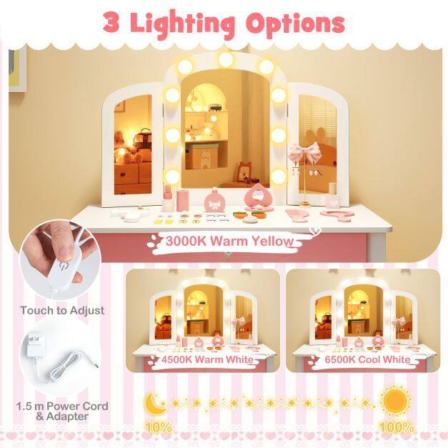 Adjustable Lighting: Kids can choose between 3 lighting modes (6500K cool white, 4500K warm white, or 3000K warm yellow), and adjust the brightness with a simple touch, making it easy and fun to find the perfect setting for dress-up time.