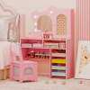 The vanity table has a mirror with 3-color lights for makeup, hair styling, or dressing up. The vanity set also includes a matching chair for your child to rest. 1 small shelf, 1 single-door cabinet, 1 bottom shelf, 2 open compartments, and 4 storage boxes offer abundant storage space. Plus, kids can place their toys and books in the fabric drawer of the chair. The anti-toppling design secures the table to the wall to avoid tipping over. The shatter-proof acrylic mirror and rounded corners make the dressing area safe enough for 3+ years old children. Furthermore, the vanity set is also UKCA compliant.
