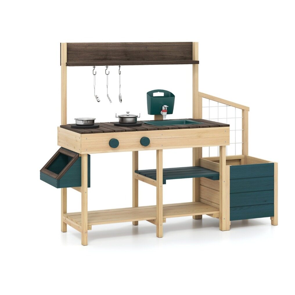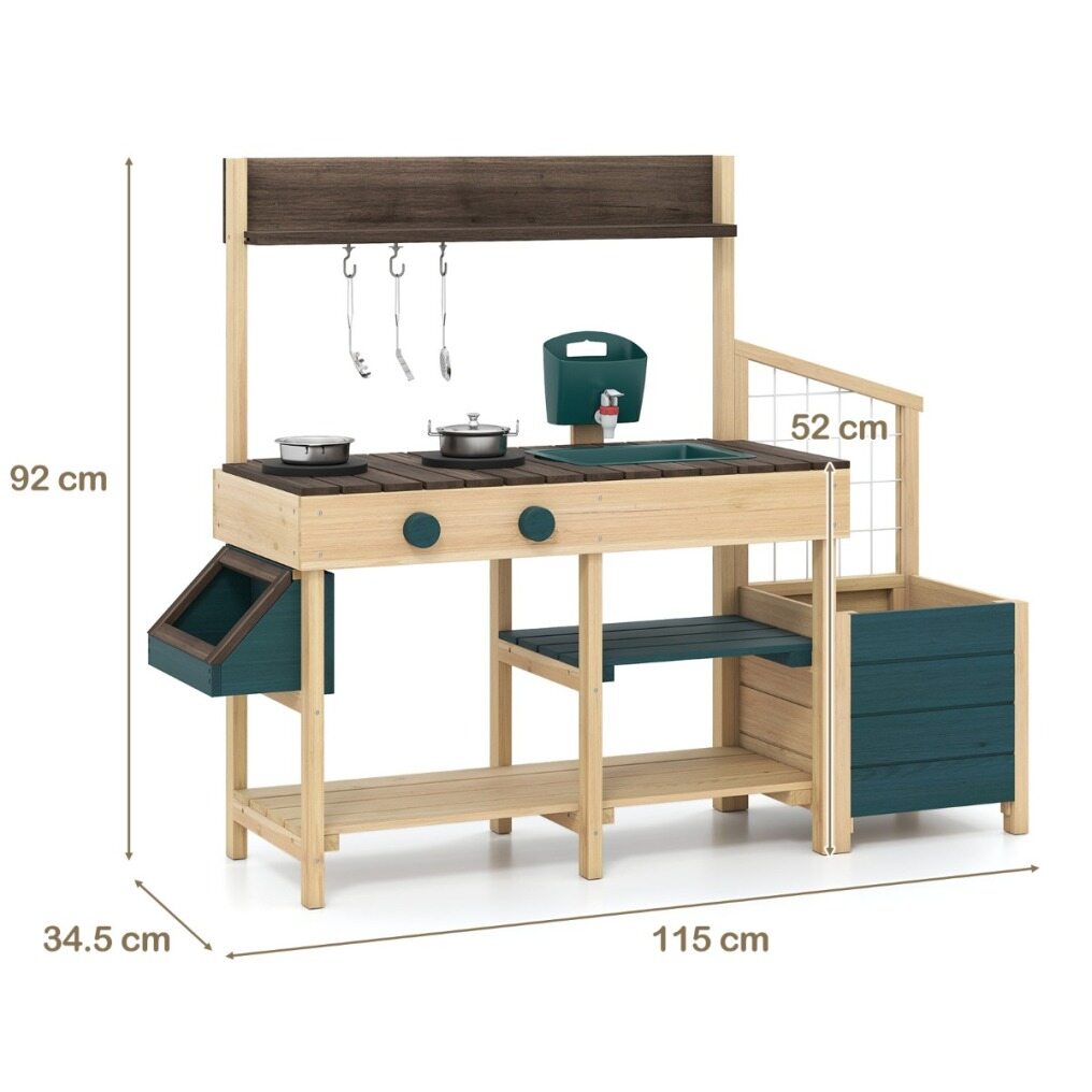 Encourage imaginative outdoor play and a love of cooking and gardening! Featuring working hobs and rotating knobs, this wooden kitchen playset offers a realistic experience that stimulates children's imagination and cooking skills. With a removable sink, faucet, and water tray, this mud kitchen provides endless outdoor fun. This kitchen playset, made from natural fir wood, ensures a child-friendly experience with smooth edges and surfaces, designed to make playtime both fun and safe. Storage shelves and hanging hooks provide ample space to store the included kitchen accessories. It's an ideal gift for children aged 3 to 8, ensuring hours of engaging play and outdoor learning.