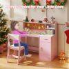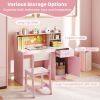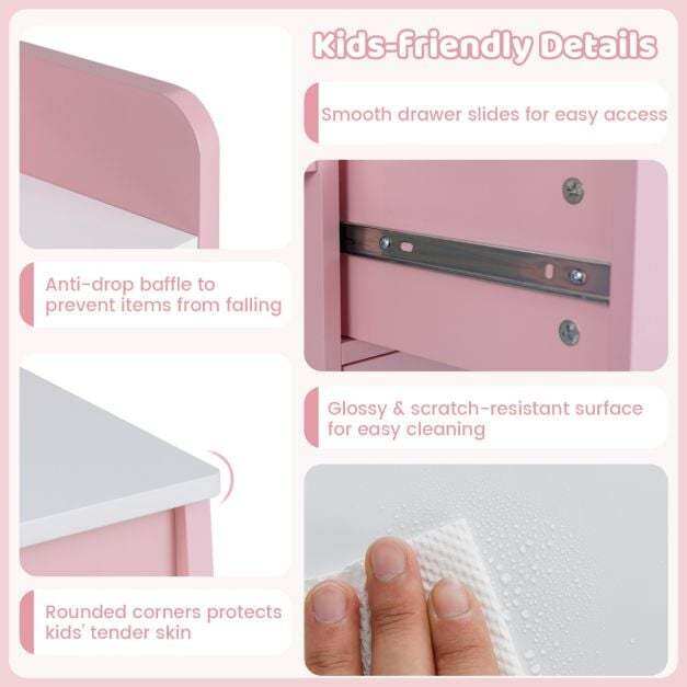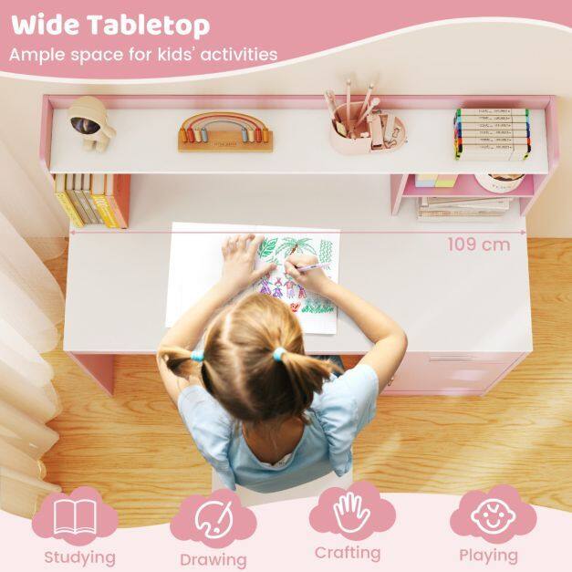 Ample Storage: This children's desk features multiple storage options, including an open shelf on top, two open compartments, a large drawer, and a storage cabinet. The generous tabletop provides ample space for various activities.