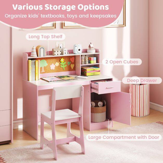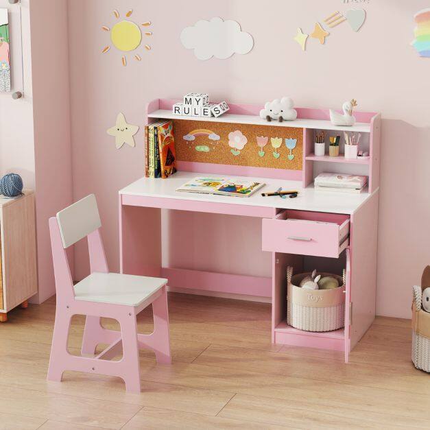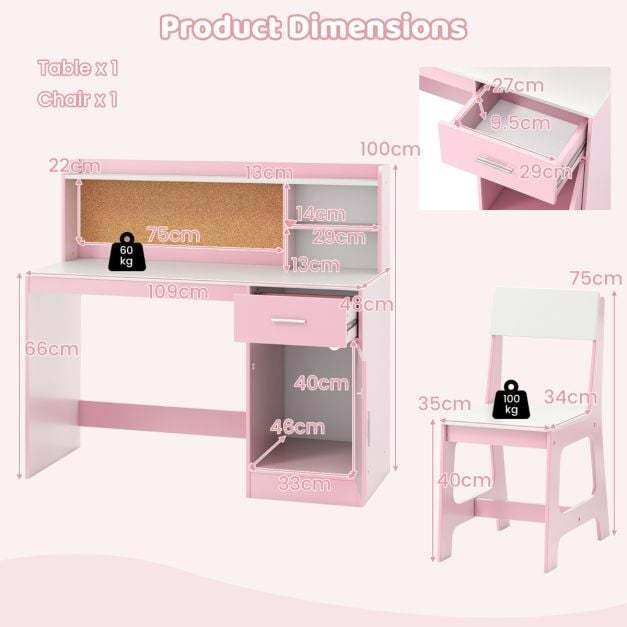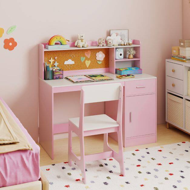 Transform your child's learning space with our kids' desk set! This children's desk offers ample storage options, including a top shelf, two open compartments, a large drawer, and a storage cabinet for organization. The desk features a convenient built-in pinboard for personalization and creativity. The included chair with an ergonomic backrest ensures comfort during learning sessions. This versatile set is perfect for studying, reading, drawing, and playing.