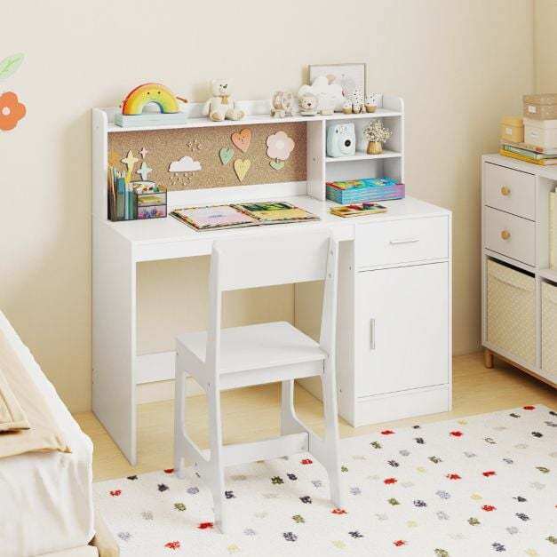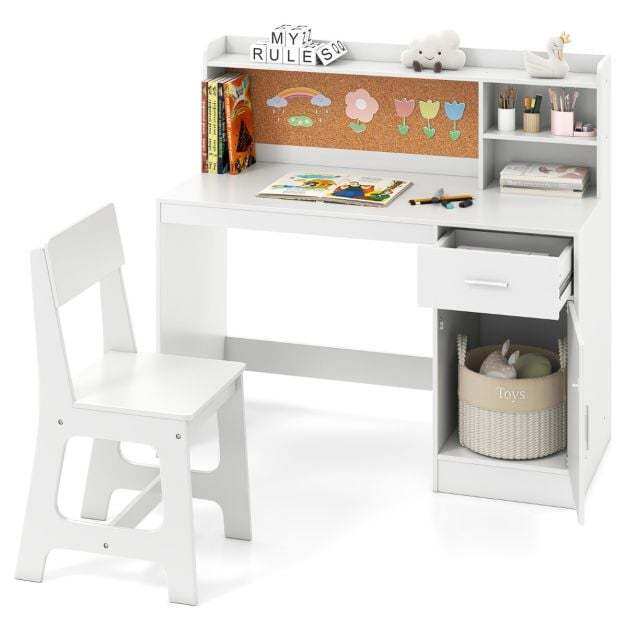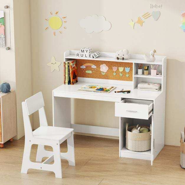 Transform your child's learning space with our kids' desk set! This children's desk offers ample storage options, including a top shelf, two open compartments, a large drawer, and a storage cabinet for organization. The desk features a convenient built-in pinboard for personalization and creativity. The included chair with an ergonomic backrest ensures comfort during learning sessions. This versatile set is perfect for studying, reading, drawing, and playing.