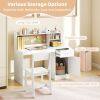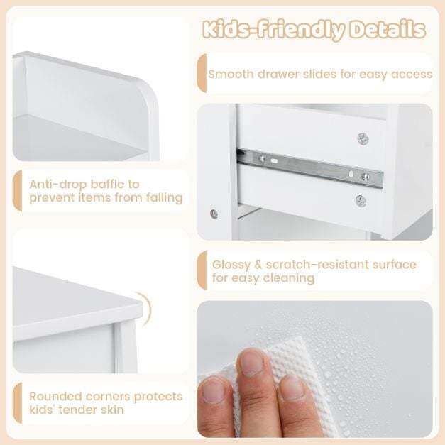Ample Storage: This children's desk features multiple storage options, including an open shelf on top, two open compartments, a large drawer, and a storage cabinet. The generous tabletop provides ample space for various activities.