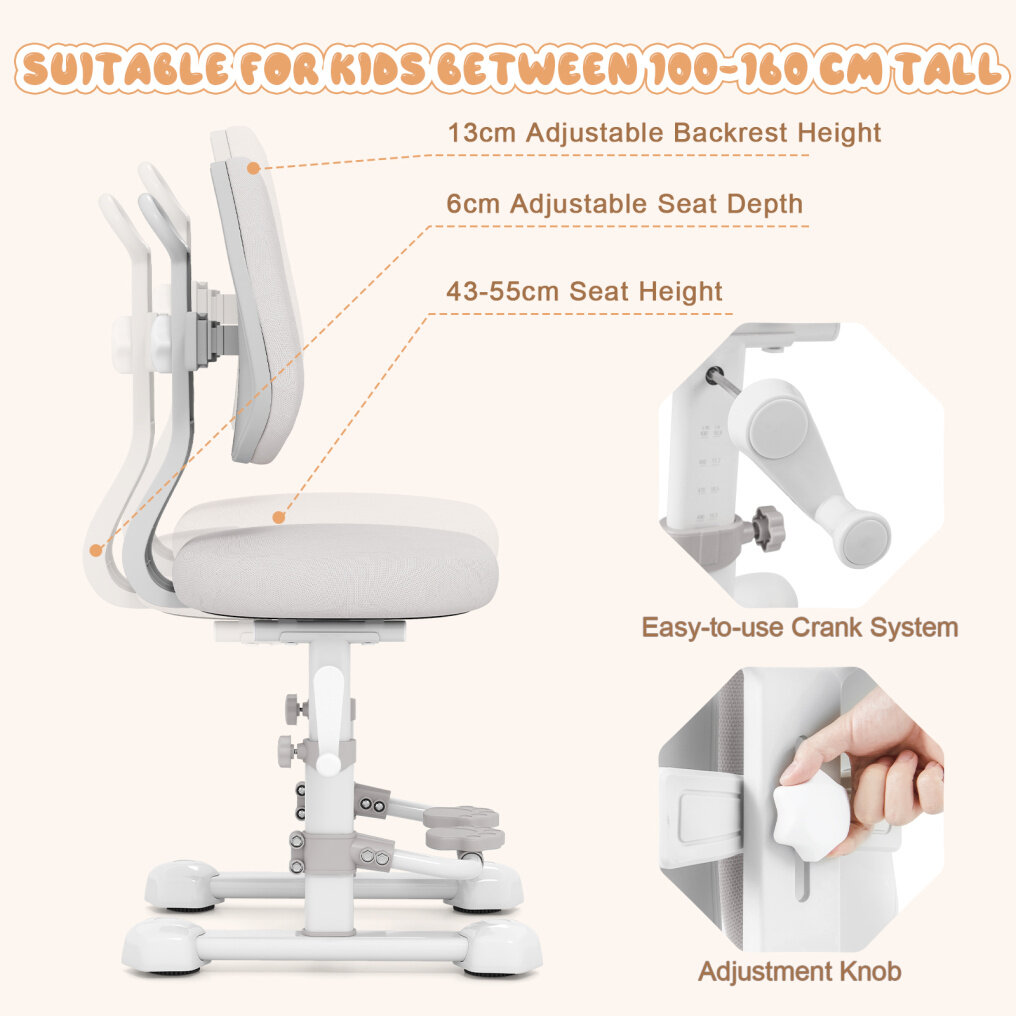 Seat Height & Depth Adjustment: The desk chair offers adjustable seat depth, tailoring the height to your child's needs as they grow. It also features stepless seat height adjustment from 43-55 cm via an easy-to-use crank system, making it suitable for children between 100-160 cm tall.