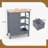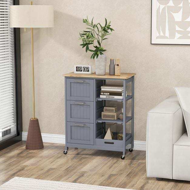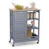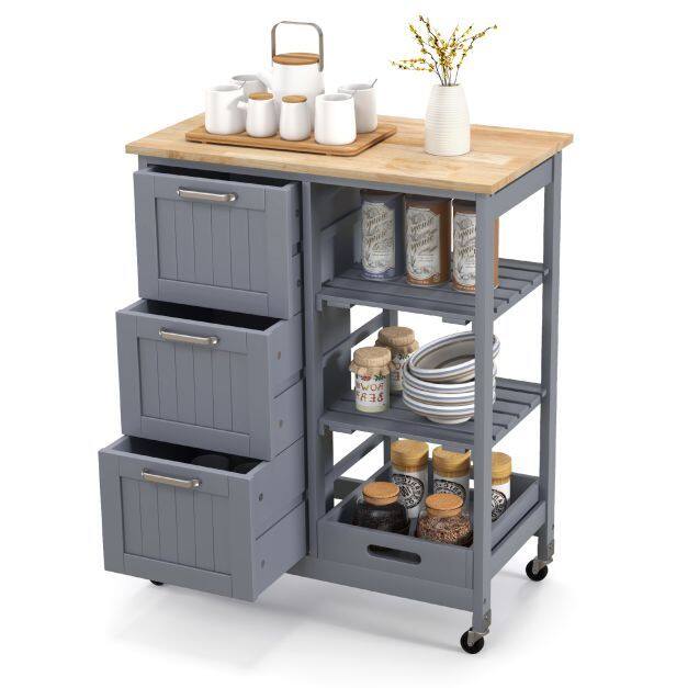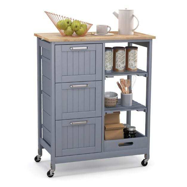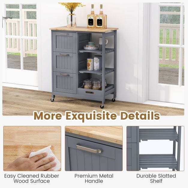 ● Classified Storage Space: Our kitchen island cart features ample & classified storage space, including 1 spacious rubber wood top, 1 removable tray, 2 slatted shelves and 3 large drawers. Besides, you are allowed to detach the tray and use it as a separate serving tray to serve food and drinks for your guests.