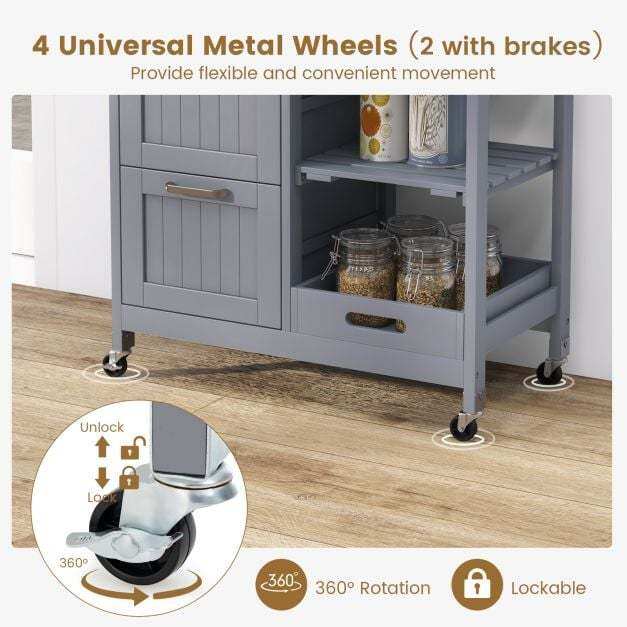 ● Super Easy to Move and Lock: This kitchen island cart is designed with 4 smooth universal wheels for easy mobility. Our upgraded casters are made of PU and metal, which function better than ordinary plastic casters. Additionally, 2 of the wheels have brakes, so that you can step on the brakes to lock it to ensure stability.