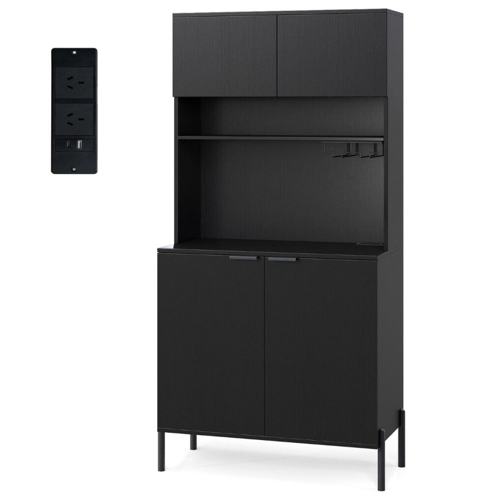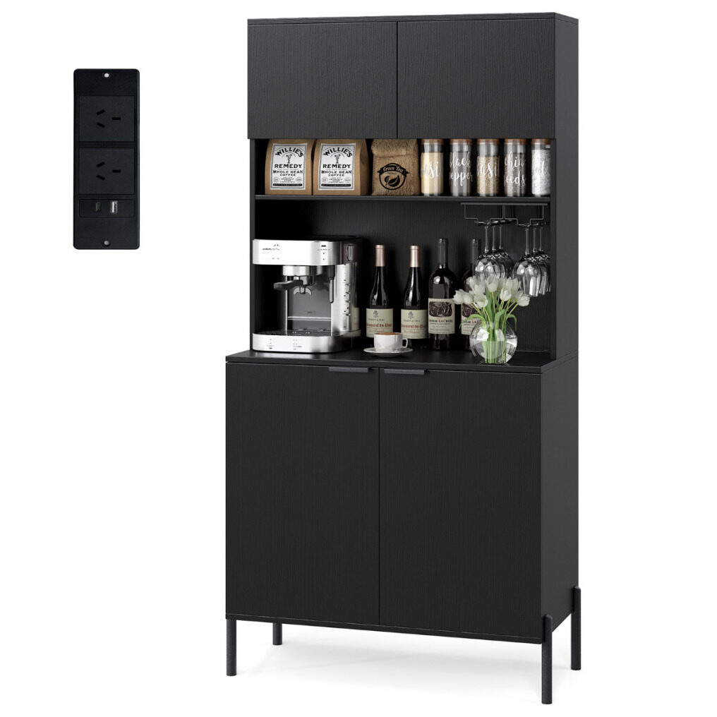 No worried about low battery or tangled cords! The recessed power strip is easy to charge multiple devices, along with a practical cable hole to manage wires. To keep up with your storage needs, the wine cabinet features open shelf and countertop to organize essentials. Inside, the adjustable shelf can be positioned in 3 positions for customized storage space. Designed for the wine enthusiast, this built-in wine glass rack is perfect for displaying your favorite glasses. The unit stands on sturdy metal legs for stability and is fitted with anti-toppling kits for added safety. All in all, it is a substantial yet tasteful addition to your kitchen, dining room or living room.