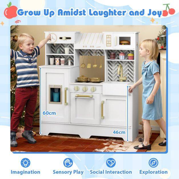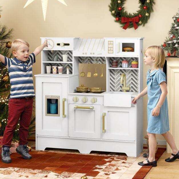 Mini Barista & Chef Combo: This wooden play kitchen lets junior chefs fire up the range hood, simmer on a 2-burner stove, bake in the oven, zap snacks in the microwave, wash veggies at the faucet sink, brew pretend lattes at the coffee station with its simulated clock, and drop "ice" from the dispenser for ultra-immersive fun. Every knob clicks and turns, giving the toy kitchen play set an authentic feel that keeps kids engaged for hours of screen-free role-play.