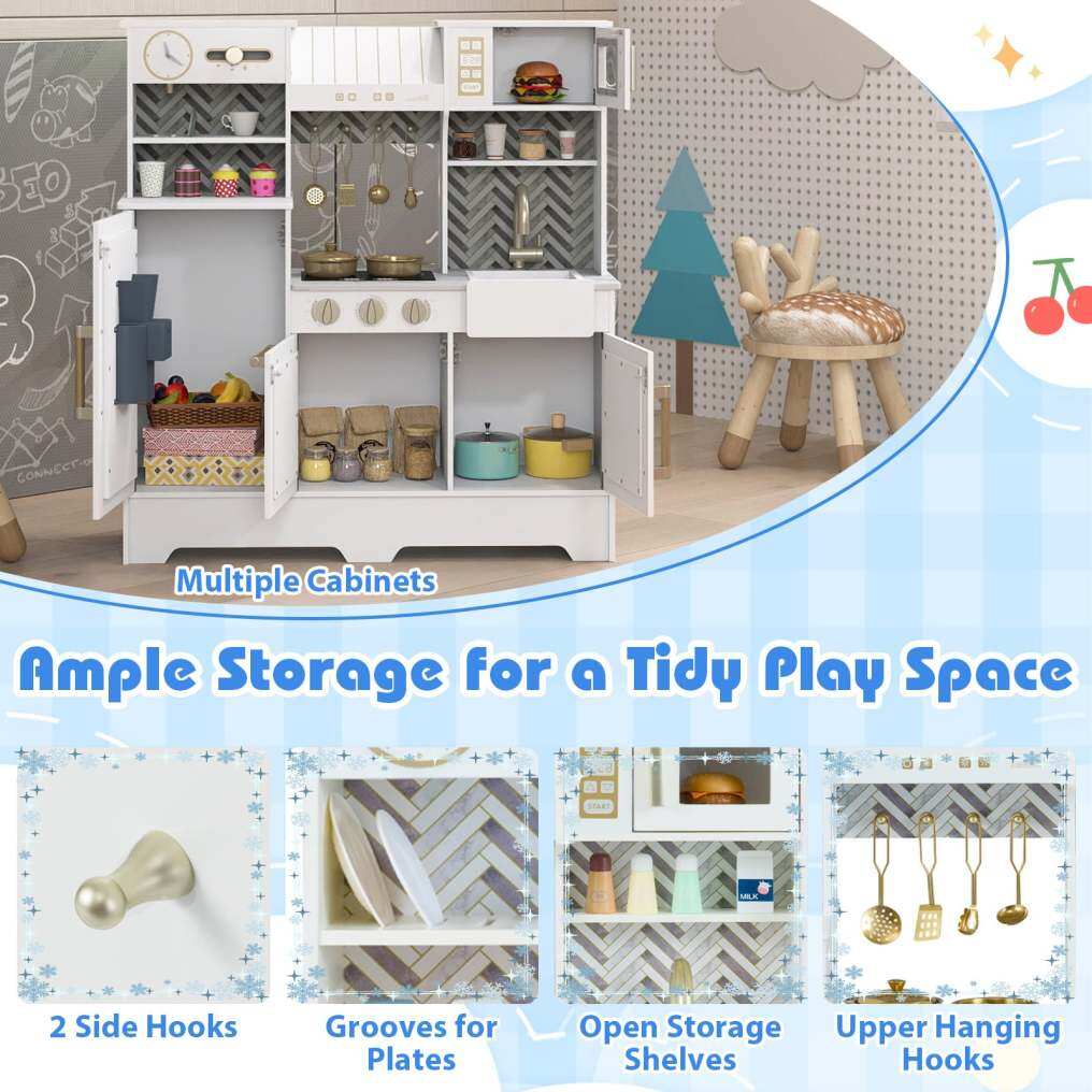 Added Safety & Stability: Designed with solid-wood legs, rounded corners, and an included anti-tip kit, this play kitchen set stays rock-steady even when energetic chefs lean in to stir. Parents relax knowing the kid's interactive play kitchen complies EN71/CPSIA for safe, wobble-free culinary adventures.