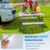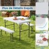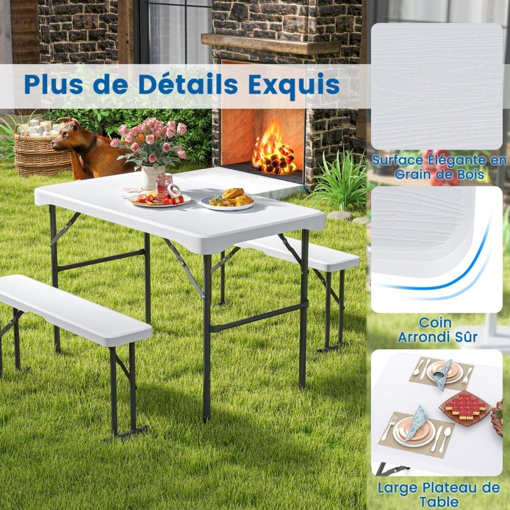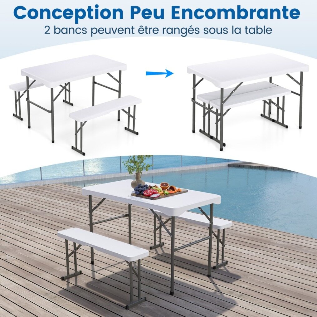Are you looking for a picnic table set that's both practical and durable? Ours comes with two benches that can be stored underneath the table to save space. When not in use, both the benches and the table can be folded for easy transport. Made from high-quality HDPE material, this outdoor furniture set is weather-resistant and wear-resistant, making it durable. Furthermore, the surface is crack- and fade-resistant, making it easy to maintain. Thanks to its high load-bearing capacity, the table can support up to 120 kg, and each bench can support 180 kg. Whether you're hosting a barbecue, enjoying an al fresco meal, or having a poolside party, this set is a practical and stylish choice for any occasion.