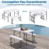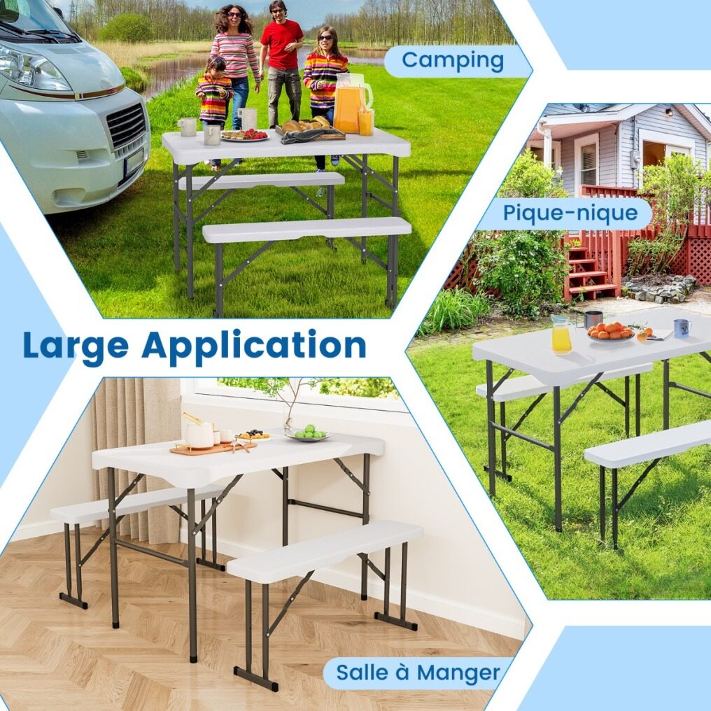 Space-saving design: The picnic table set comes with two benches that can be easily stored underneath the table. The entire set can also be folded for effortless storage or transport, making it ideal for outdoor activities.