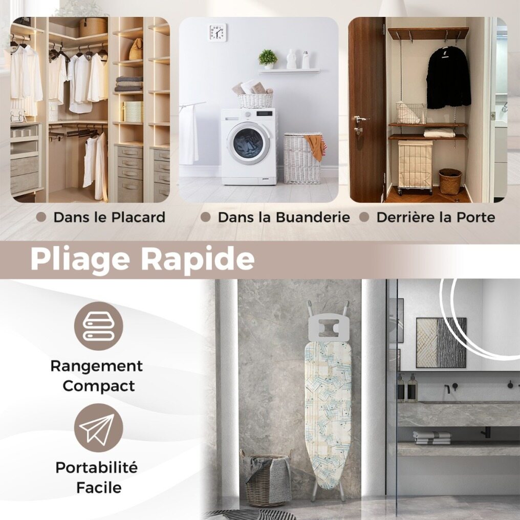 Quick Folding Function: The fully assembled ironing board can be easily folded and stored in closets, behind doors or in tight spaces. Plus, it only weighs 3.5-4.5kg, making portability effortless.