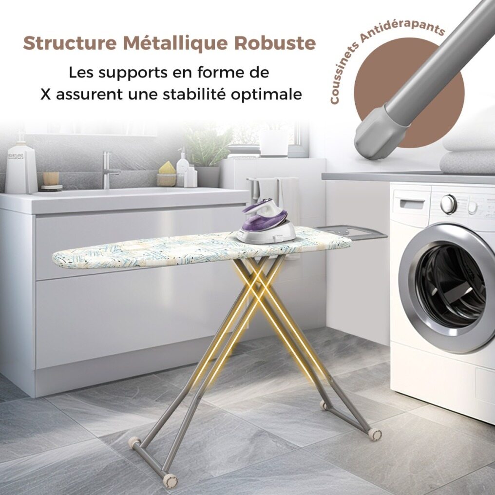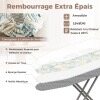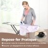 Sturdy carbon steel construction: The large ironing board features a carbon steel structure with a high load capacity of 30 kg. In addition, it is equipped with non-slip foot pads for optimal stability and has an iron rest for additional comfort.