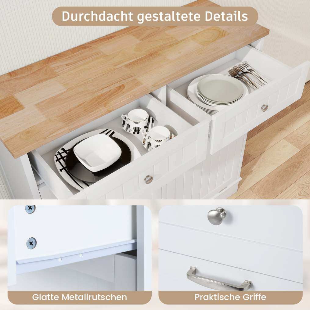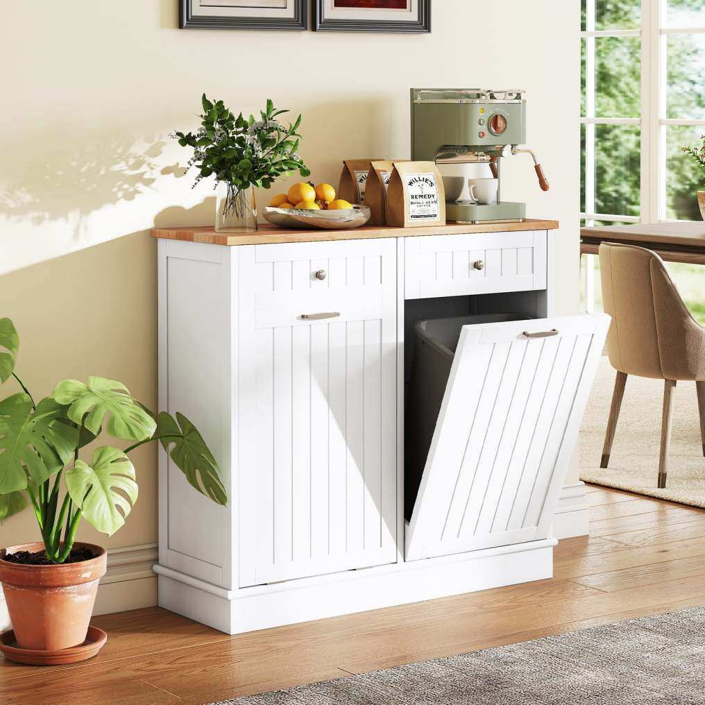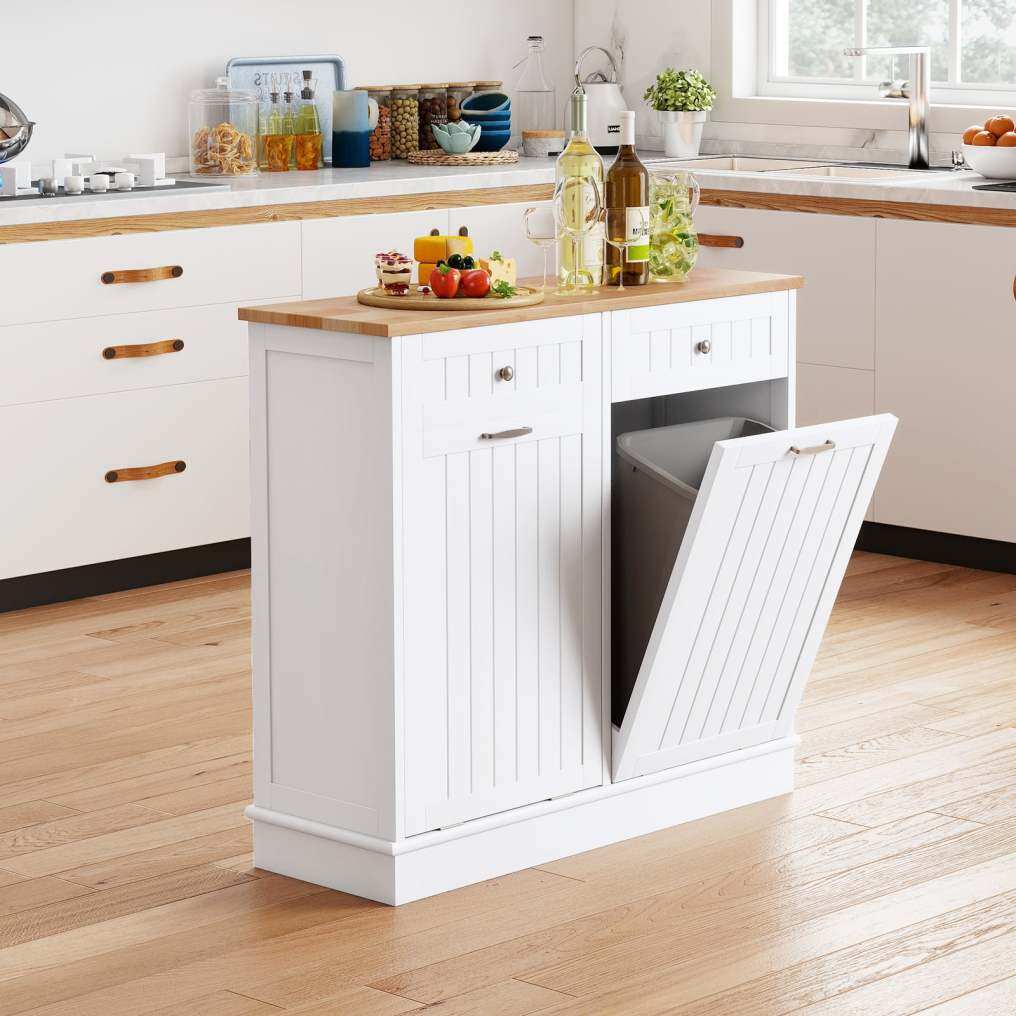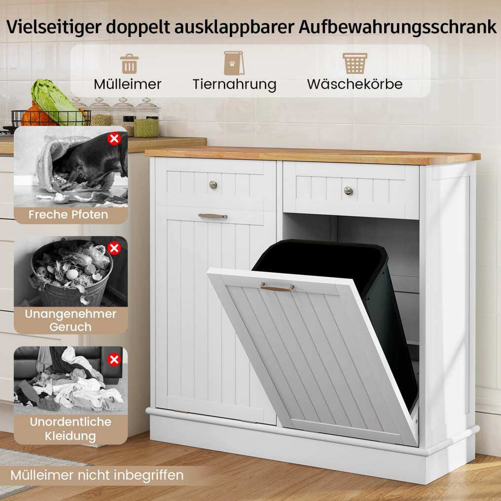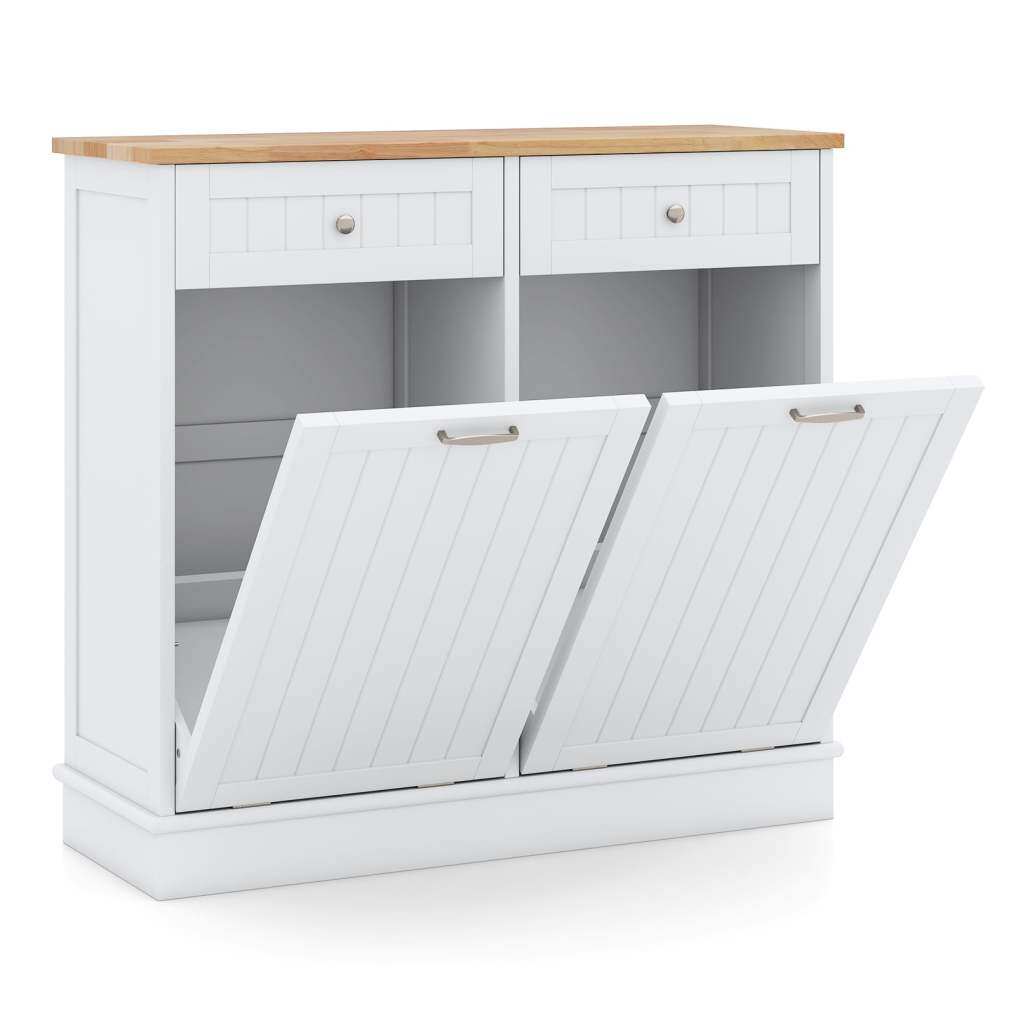 Discover the secret to a tidy kitchen with this chic, multifunctional tilting waste bin cabinet! It elegantly conceals your waste containers and traps unpleasant odors, while also providing a clever workstation with a solid rubberwood top that can handle any culinary challenge. Organize effortlessly with two additional drawers, ideal for delicate dishes, and ensure safety with our special anti-tip design. Crafted from sturdy MDF and designed with a refined farmhouse style, this waste bin cabinet combines functionality and charm in your kitchen or beyond. Don't miss out on this versatile waste cabinet—transform your space today!