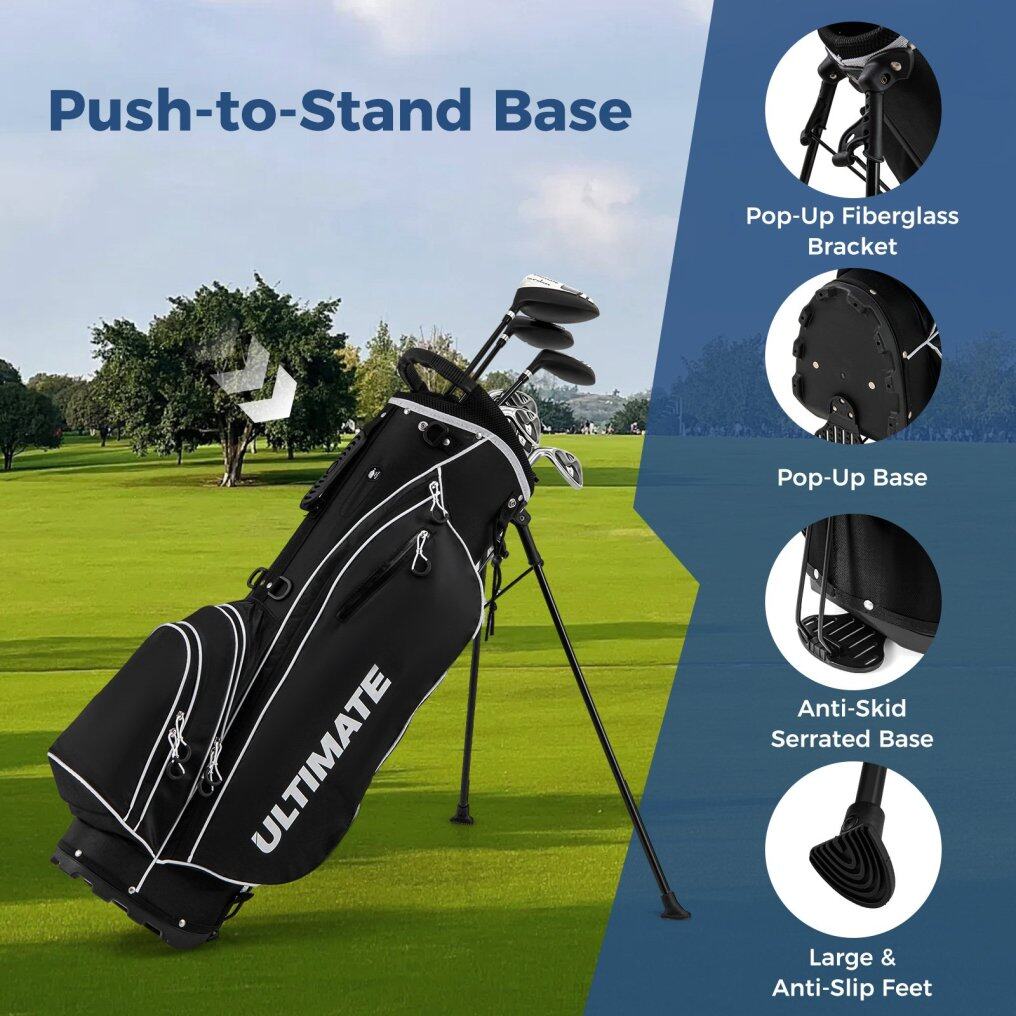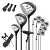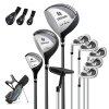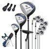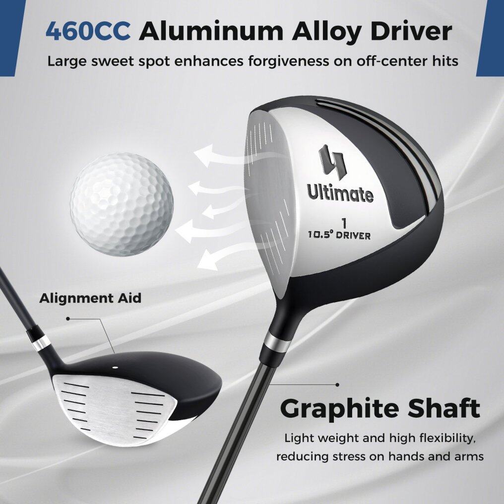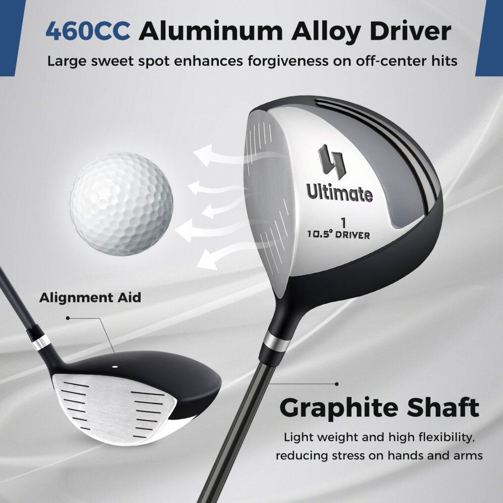 This set includes a #1 driver, #3 wood, #4 hybrid, #6-9 irons, #P iron, putter, and a stand bag with rain hood. The powerful 460CC driver features a large sweet spot and high-rebound face for long drives, while the graphite shaft minimizes fatigue. The golf bag offers an 8-way divider and 5 zippered pockets, including a waterproof one, plus a large apparel pocket, two smaller side pockets, and a front pocket, for easy storage and organization on the course. The bag is equipped with a waist pad and dual shoulder straps for comfortable carrying.