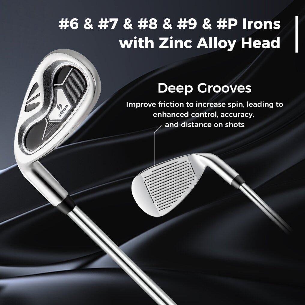 【High Performance Iron Set】Consisting of #6, #7, #8, #9 and #P irons made of zinc alloy, each with a low center of gravity for improved swing stability. Deep grooves in the face increase friction for more spin, improving control, accuracy and distance.