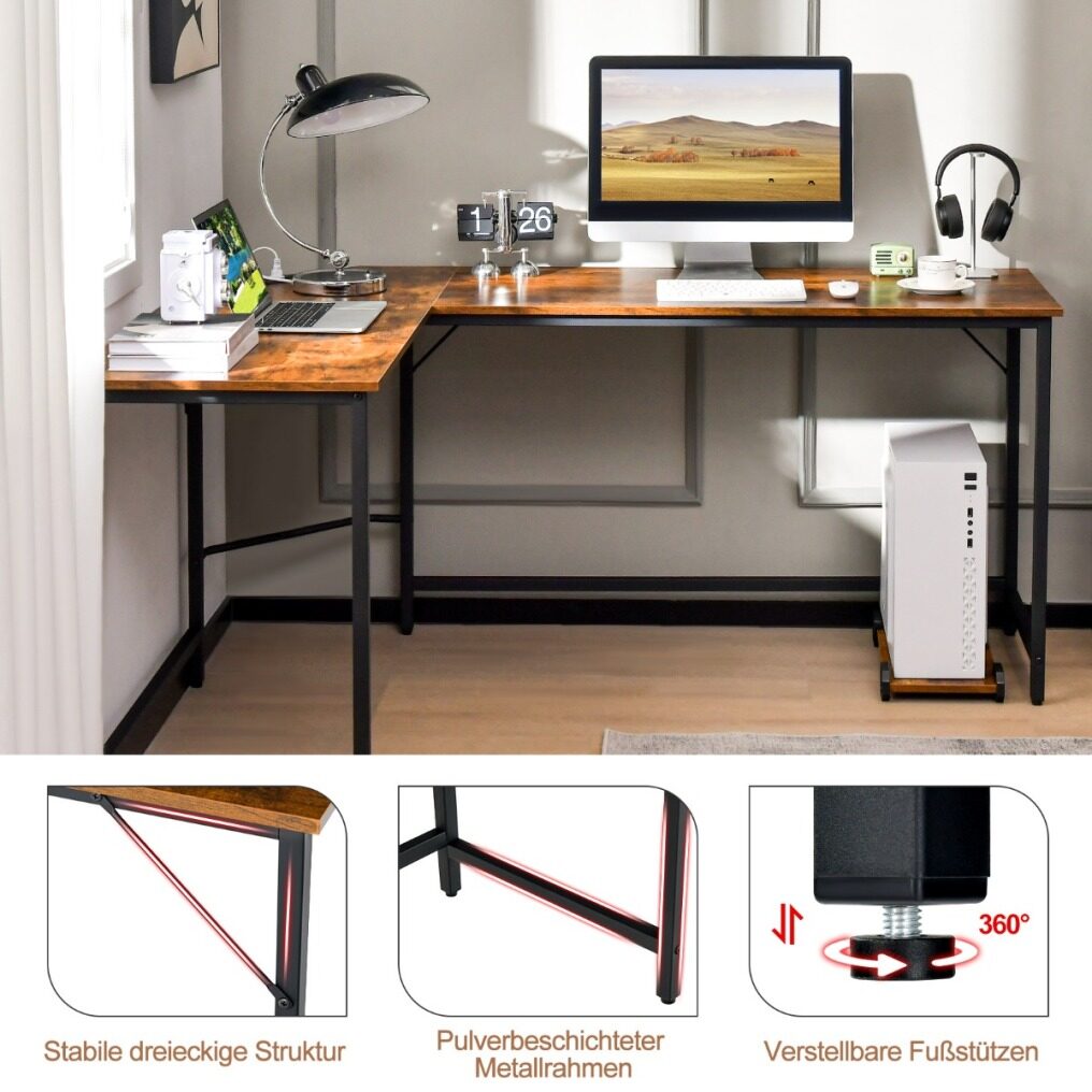 Sturdy Metal Construction: Made of powder-coated metal frame and thickened tabletop, the L-shaped computer desk features remarkable sturdiness, durability and longer service life. It has a load capacity of 150kg without wobbling. In addition, adjustable foot pads improve overall stability and provide floor protection.