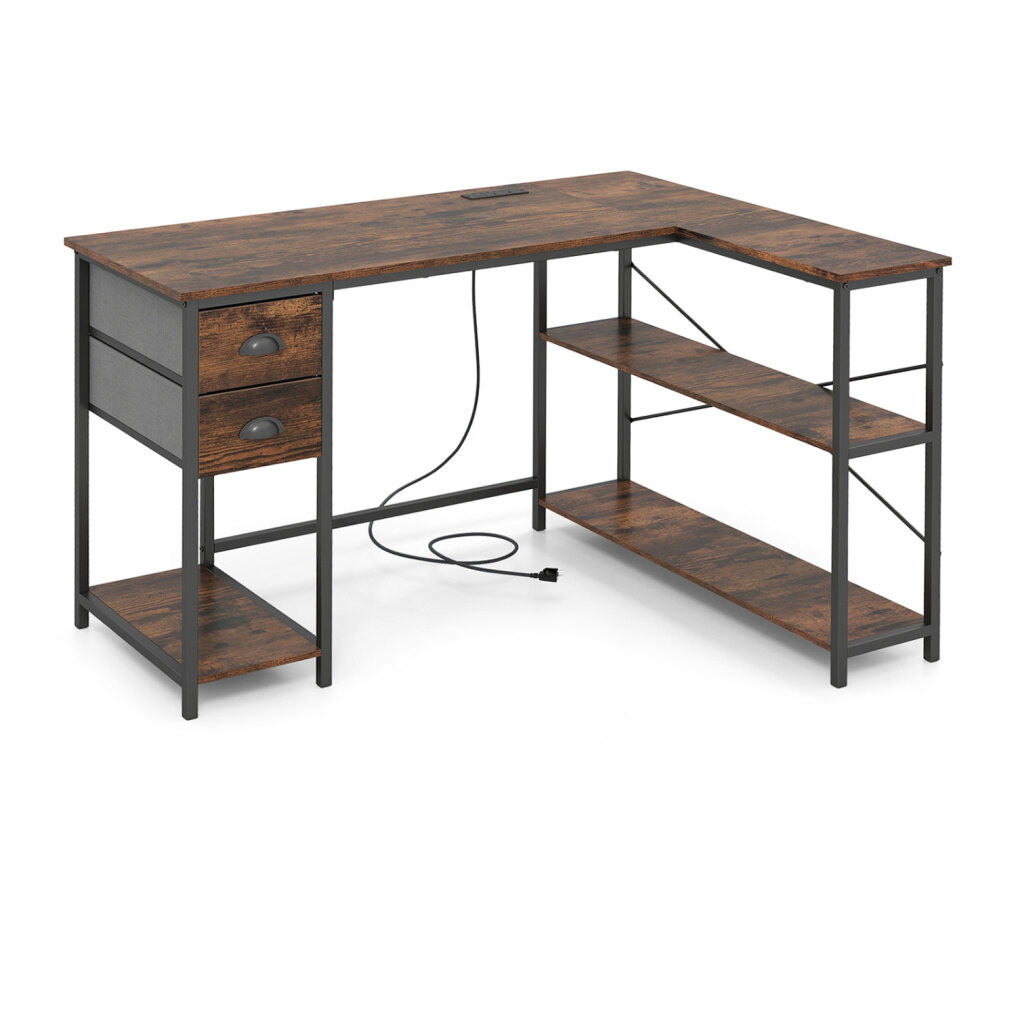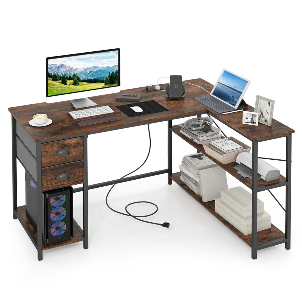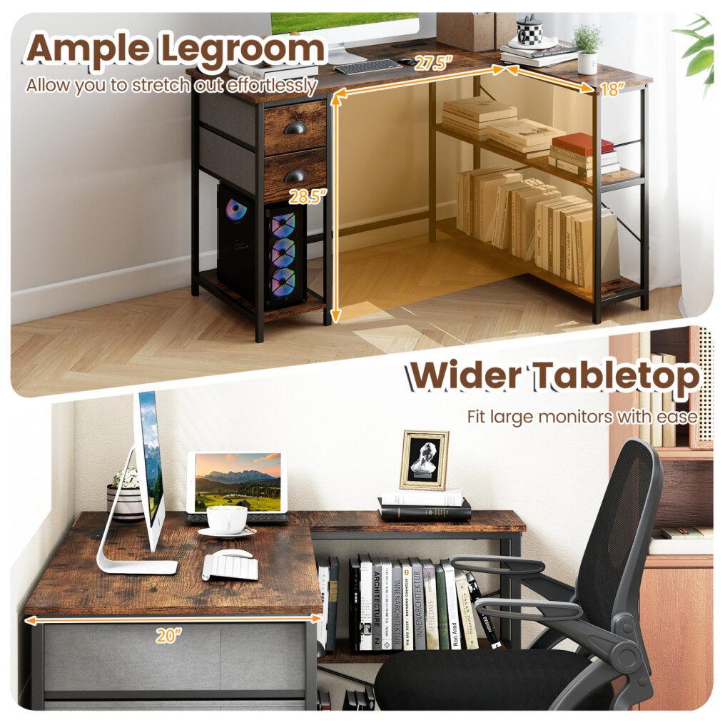 ● Integrated Charging Hub: This L-shaped desk is equipped with recessed power strip to keep your workspace free of cable clutter. 2 outlets, 1 USB port, and 1 Type-C port allow you to easily charge multiple devices at once.