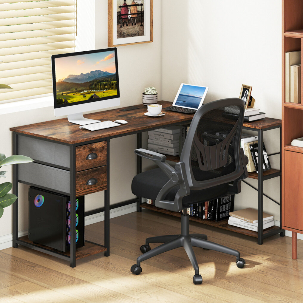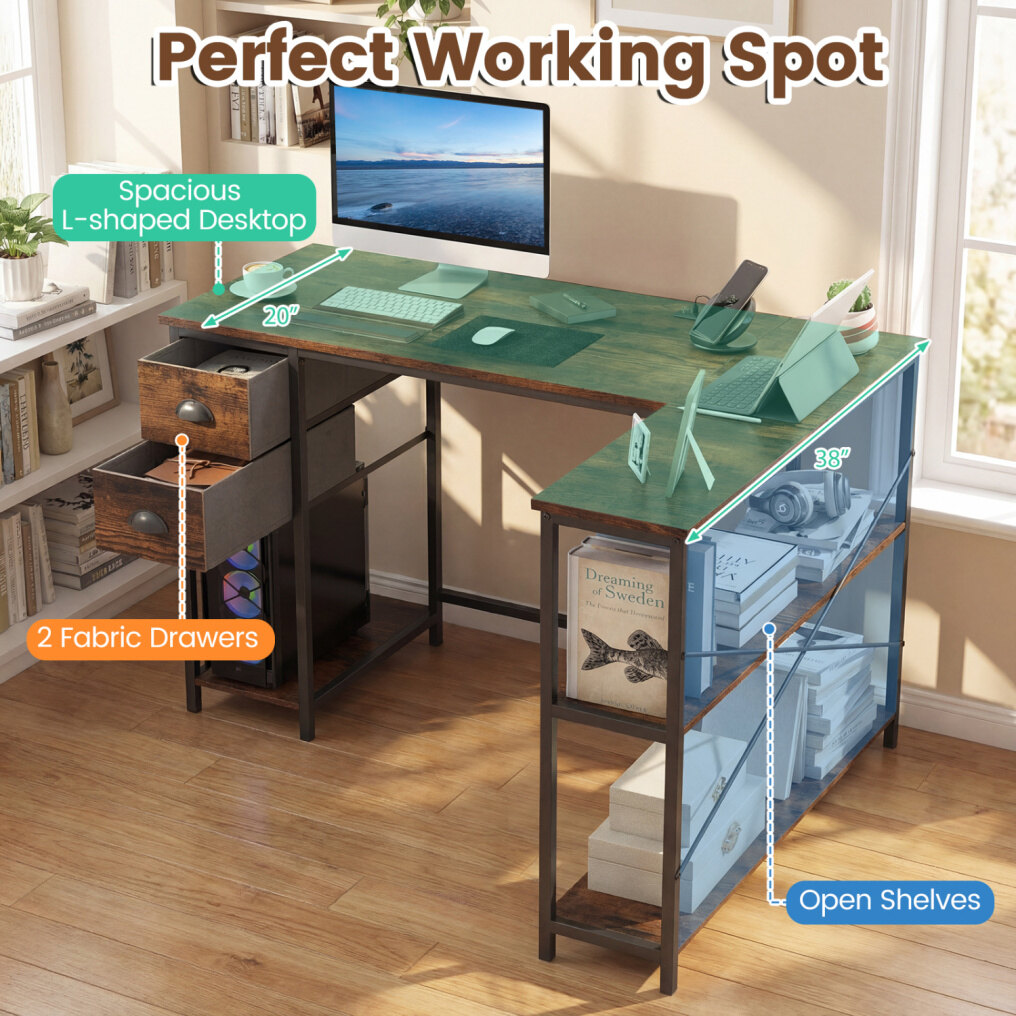 ● Generous Storage Solutions: Equipped with a spacious tabletop and 2 fabric drawers, this computer desk offers ample room to store your office essentials. Additional shelving units provide organized spaces for daily items.