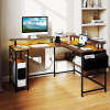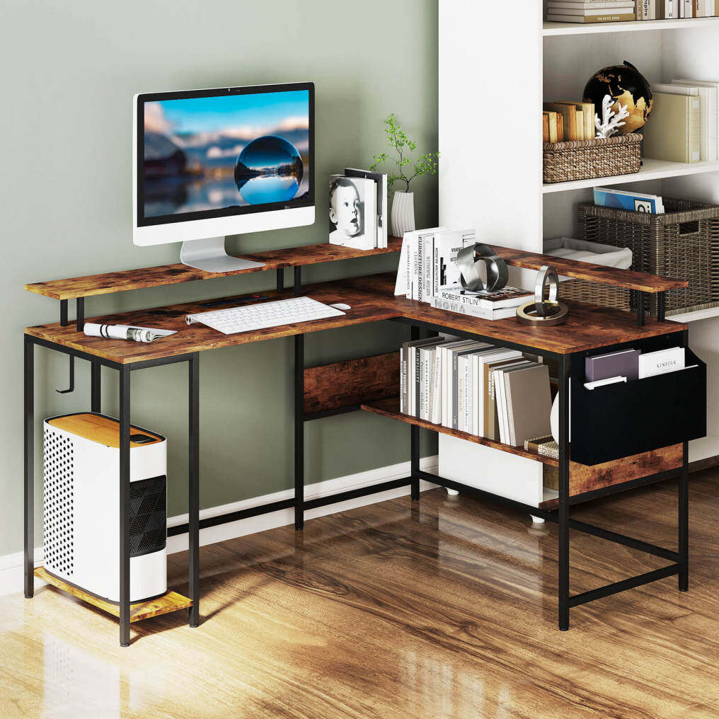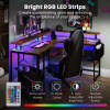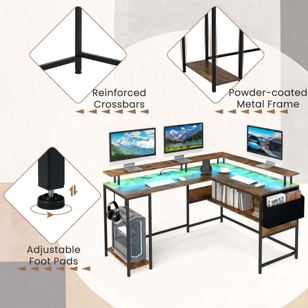 Bright RGB LED strips create a captivating glow and enhance the ambiance of your space. The built-in charging station with on-off switch is designed to keep all your devices powered up. The L-shaped desktop offers ample space to accommodate multiple monitors. The storage shelf under the desk helps in keeping books or gaming supplies neatly stored. Besides, the CPU stand keeps your computer tower off the ground, while the attached fabric bag and metal hook offer additional storage space for accessories. The elevated monitor stand raises your screen to an ergonomic height, reducing neck strain and promoting a better viewing angle. Crafted with heavy-duty metal frame, the L-shaped gaming desk is built to last. this L-shaped desk fits perfectly in any corner and maximizes your home office space efficiently.