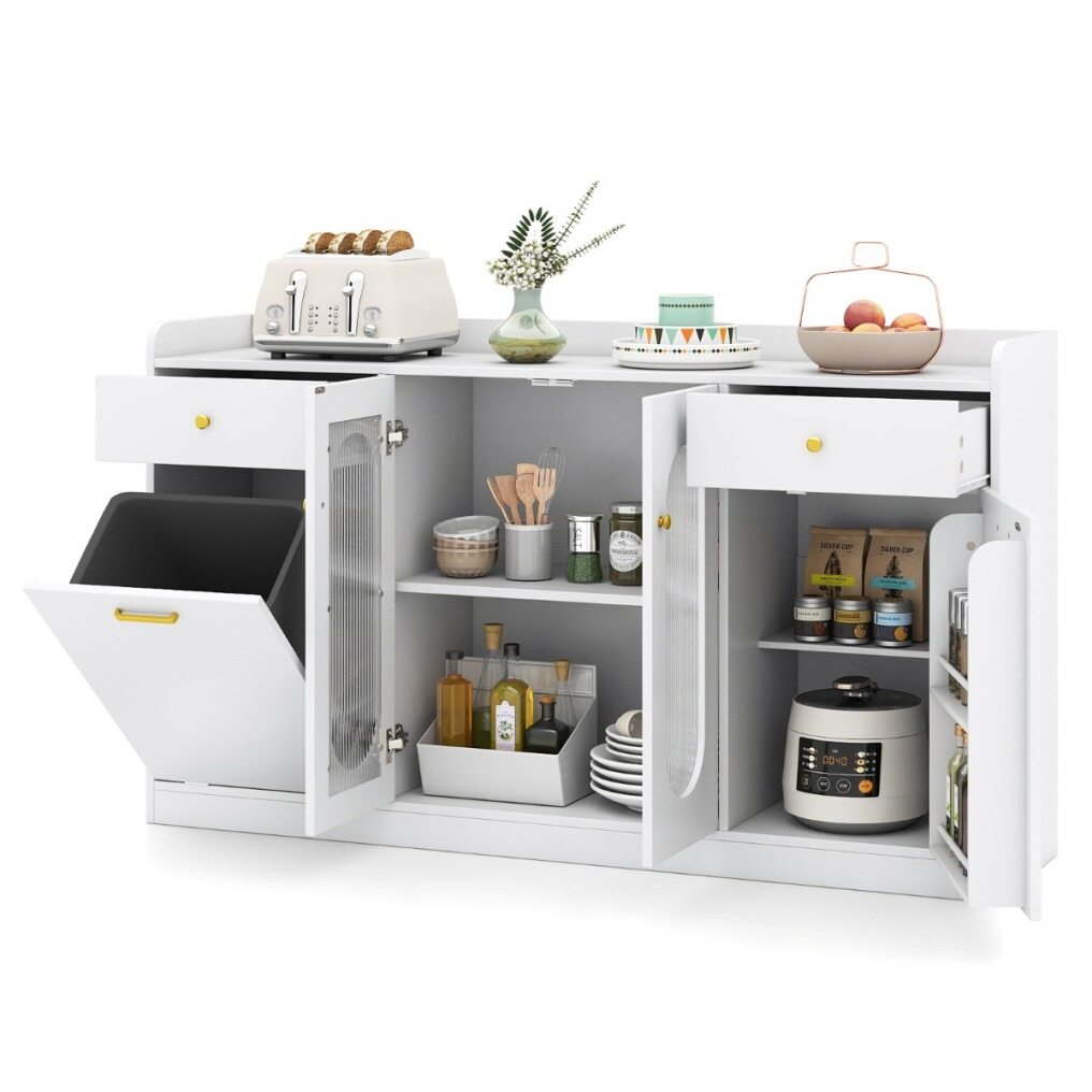 ● Hidden Trash Can Storage: Equipped with a trash can cabinet, this sideboard is designed to make your kitchen neat and aesthetically pleasing. The secure tilt-out design conceals the trash can from view while staying quick to access. It fits a 11.5 gallon trash can (not included).