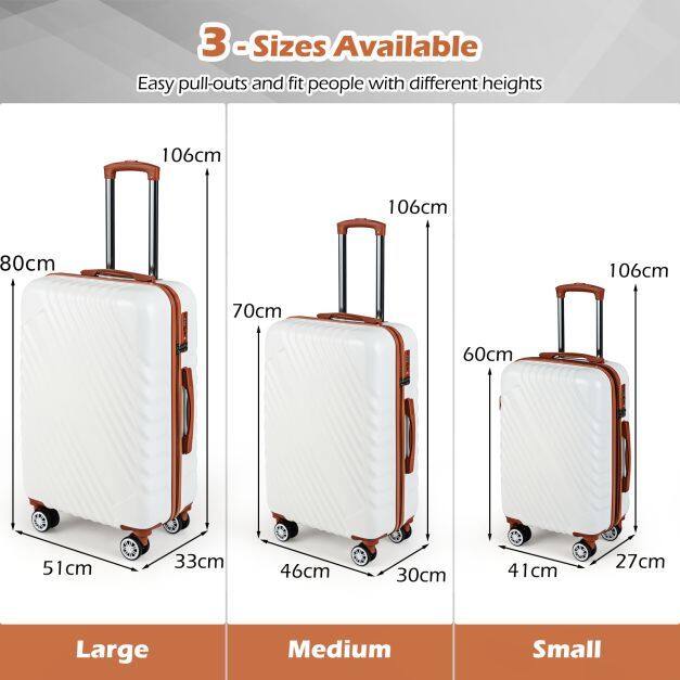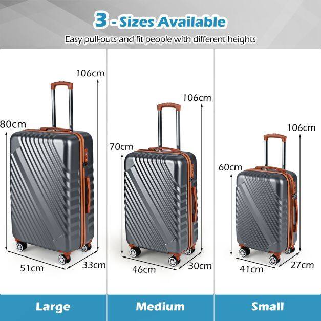 3-Piece Suitcase Set: This carry-on luggage set is perfect for family trips, whether road-tripping or flying. It features 3 different sizes: Large: 51 x 33 x 89 cm(L x W x H). Medium: 46 x 30 x 70 cm(L x W x H). Small: 41 x 27 x 60 cm(L x W x H)