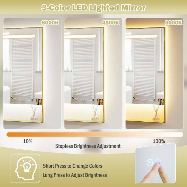 3-Color LED Lighted Mirror: Equipped with 3 LED color temperatures—3000K warm light, 4500K natural light and 6000K cool light—this mirror allows you to customize your illumination. You can also adjust brightness steplessly from 10% to 100%. There is a short press to change colors and a long press to adjust brightness.
