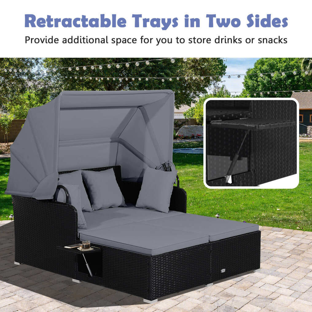 Retractable Canopy and Folding Side Tables: This outdoor daybed features a retractable canopy with fixed ropes that allows you to read and rest under the shade or just enjoy the sunbath. When the canopy is retracted, it needs to be fixed with ropes. Likewise, the side tables on both sides are retractable as well to make needed close to hand. All you need to do is use the pneumatic rod for safe and easy adjustment.