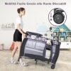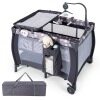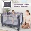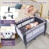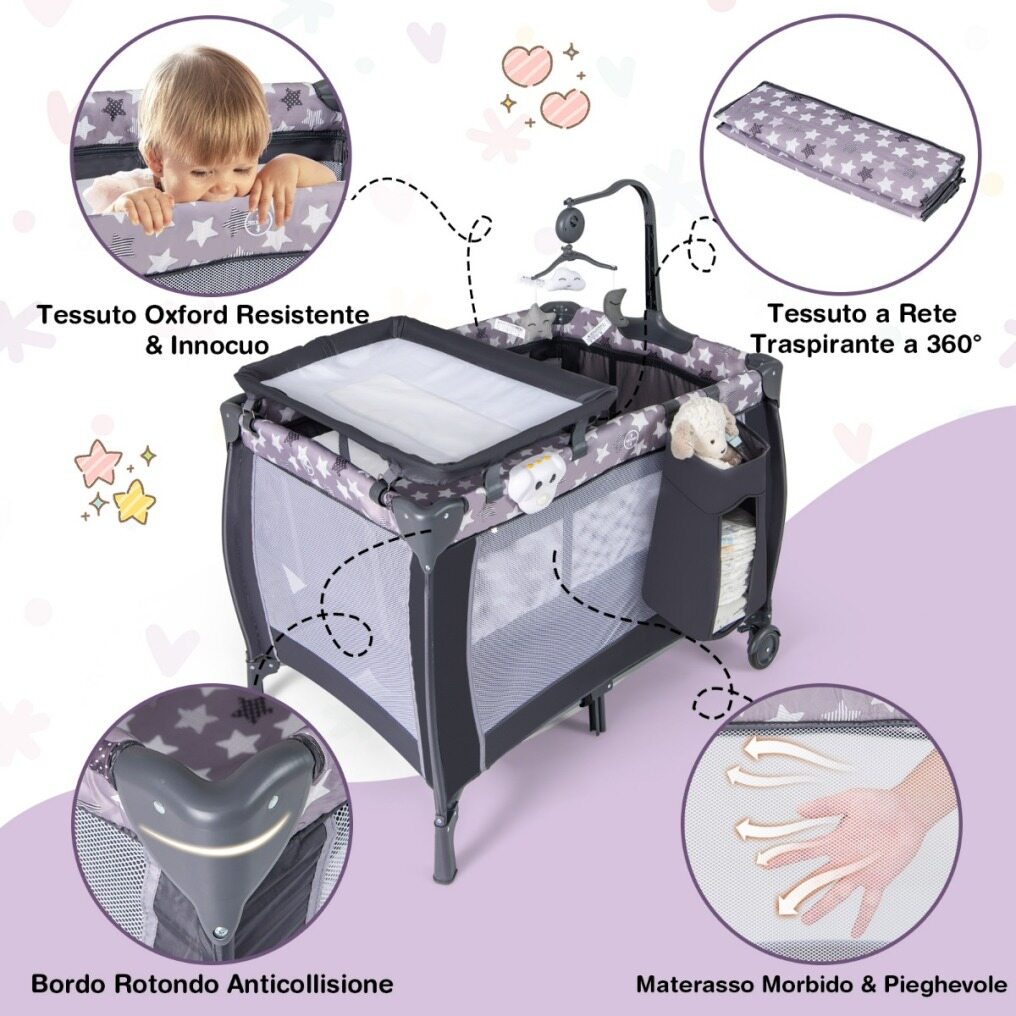 Make baby care a breeze with this foldable travel cot! The foldable travel cot comes with a changing table and a full-size bassinet to accommodate your growing baby. Additionally, the high-quality Oxford fabric and sturdy metal frame ensure durability and stability. The transparent, breathable mesh lets you know your baby's condition. With a comfortable mattress, your baby can sleep soundly and sweetly. Additionally, the adorable toys and music box make this portable travel cot even more appealing to newborns. When you need to move the foldable travel cot, the smooth wheels are very useful. Plus, it's super easy to unfold or fold. With a convenient carry bag, you can take it wherever you go.