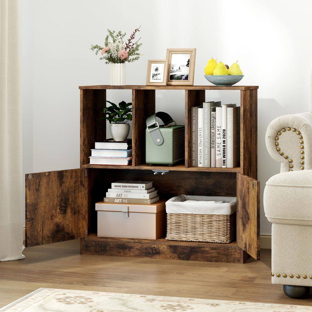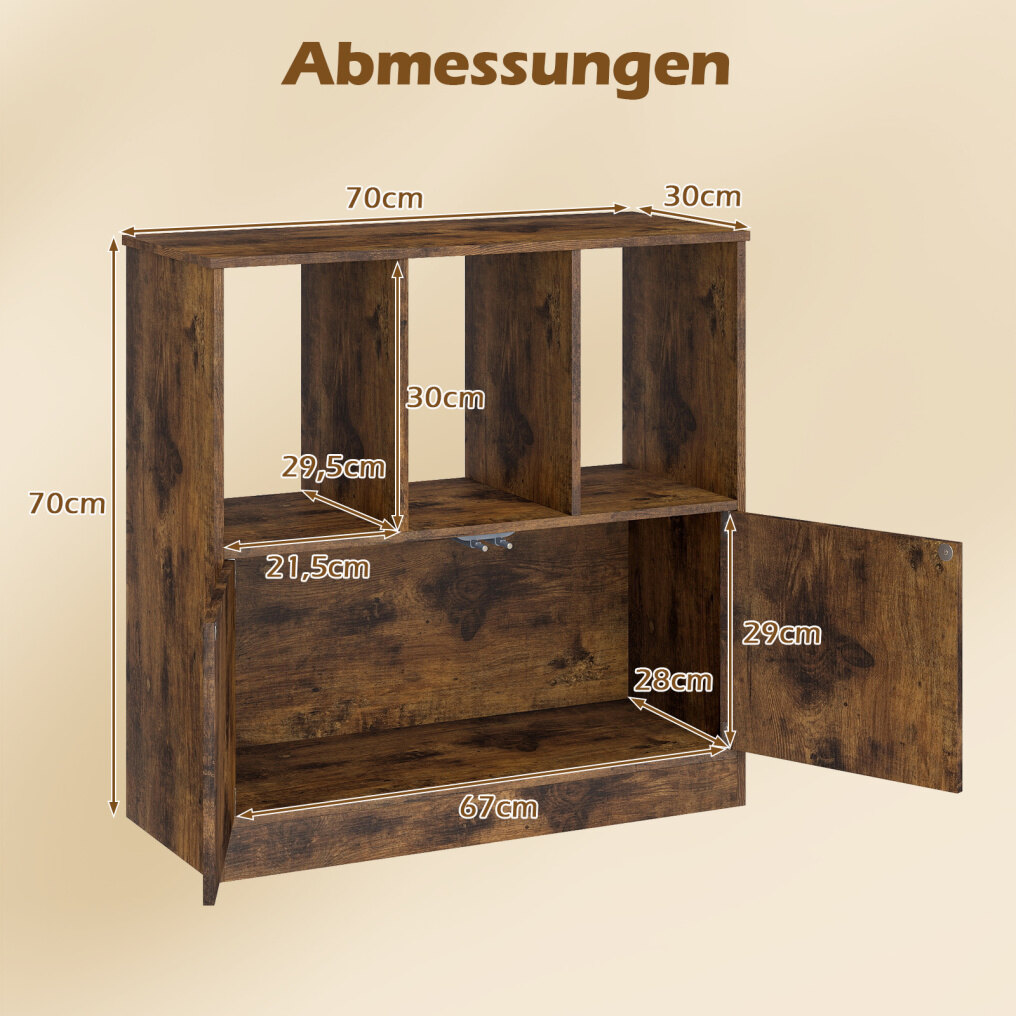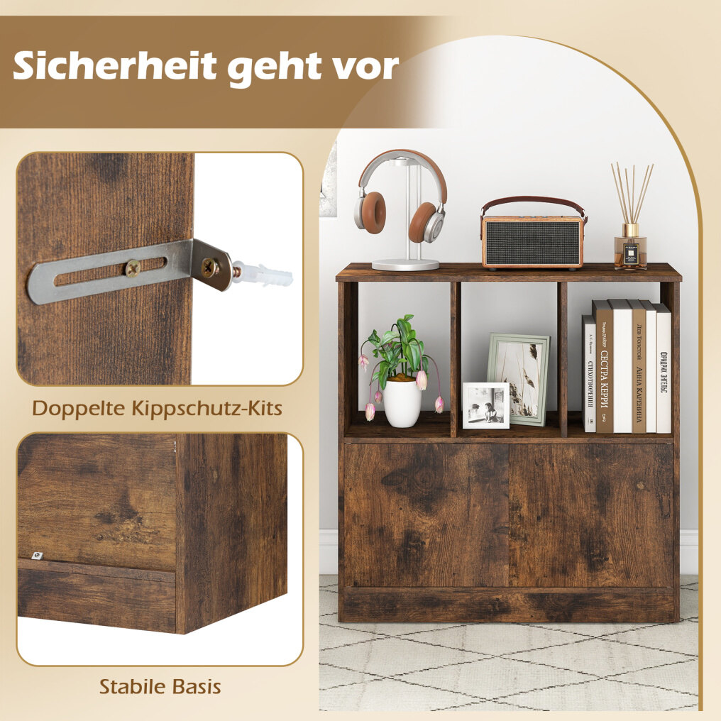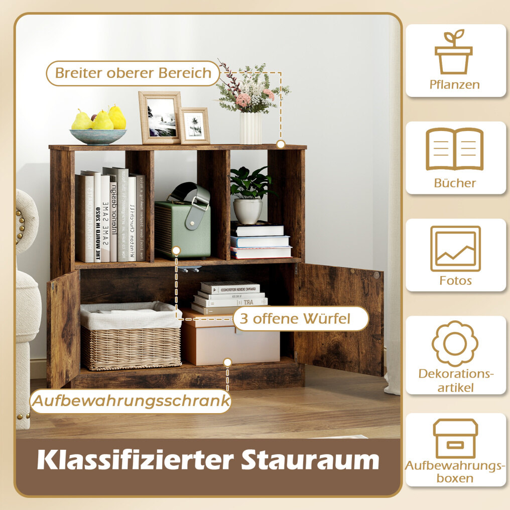 With three open cubes, this bookshelf offers ample space to display books, photos, plants, or storage boxes. The enclosed cabinet provides concealed storage for items, ensuring a neat and tidy appearance. Equipped with two anti-tip devices, this modern display shelf offers added safety thanks to its secure wall mounting. This contemporary cube shelf serves not only as a bookshelf but also as a versatile display and storage unit. Its functionality is complemented by its attractive design, making this freestanding shelf an ideal addition to both home and office.