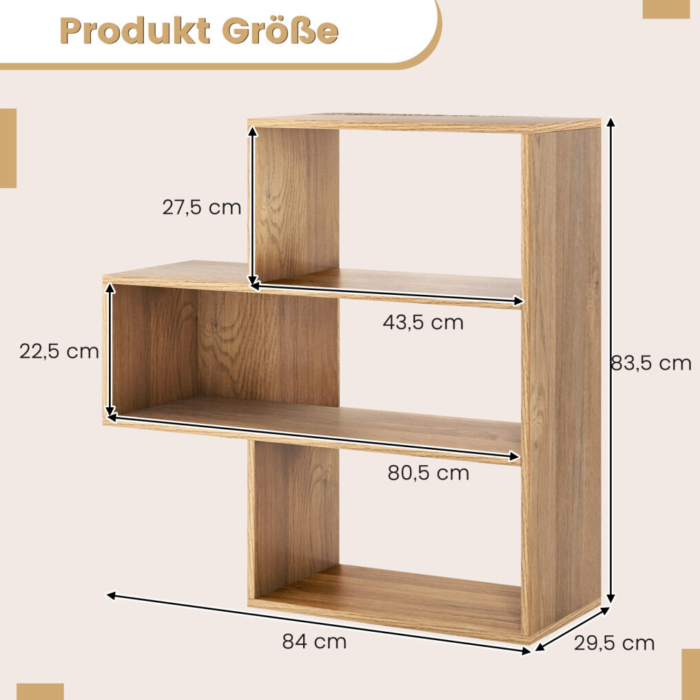 This concave/convex bookcase impresses with its geometric shape and adds a touch of charm to any room. Featuring three shelves of varying sizes, the bookcase offers a practical storage solution for a variety of items. Constructed of durable engineered wood, the bookcase is sturdy and reliable for long-term use. Furthermore, two anti-tip devices make the bookcase a reliable addition to your living space. Beyond its practical features, the bookcase is a versatile storage solution that combines modern style with elegant looks!