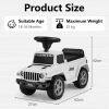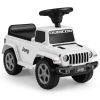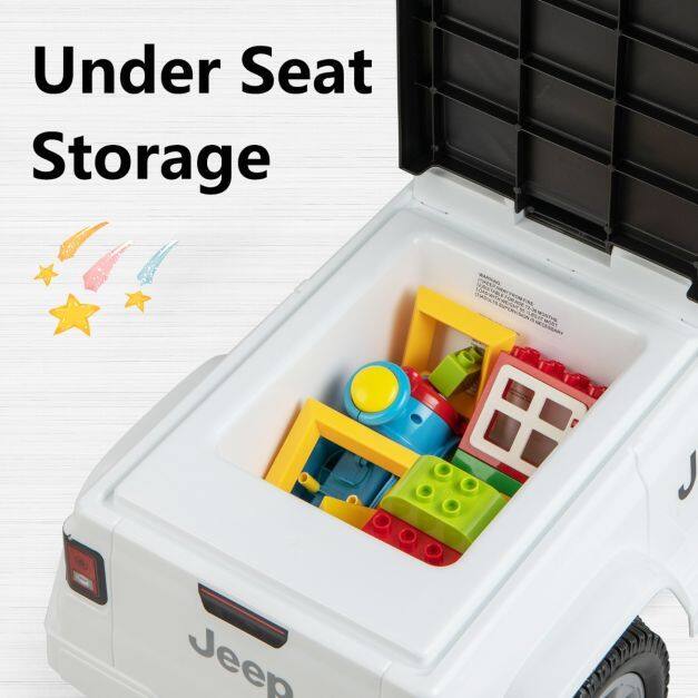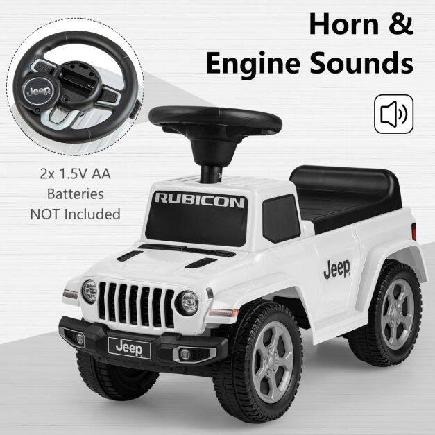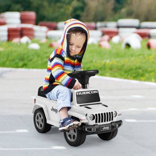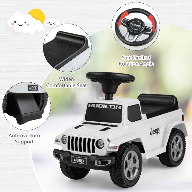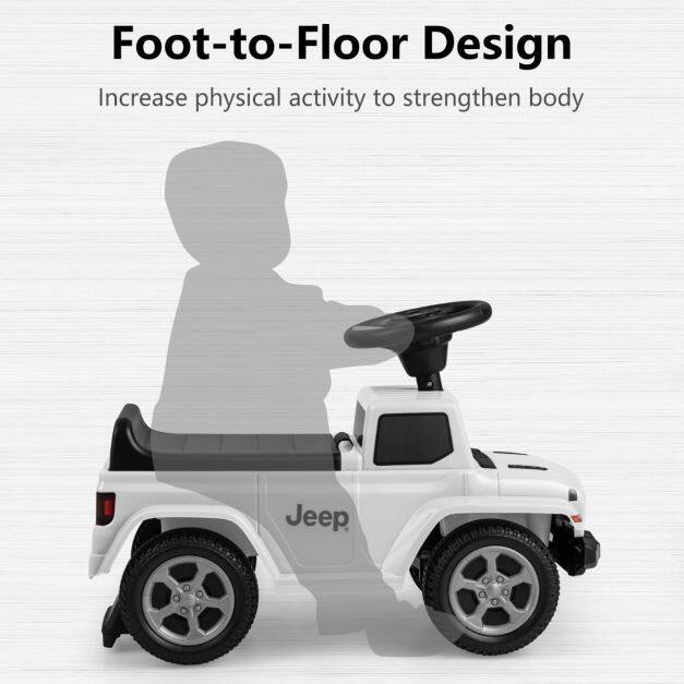 Impress your little one with this Jeep licensed ride on push car! With striking stylish appearance and luxury details, toddlers will be attracted by this push ride-on car. It features 2 ways to use, and kids can choose to slide the car by foot or push the car to move. And the reasonable seat height design enables kids to get on or off the car with ease. Fitted with anti-falling device, the toddler ride on car won't easily roll over. Moreover, the steering wheel is designed with 2 buttons for your little one to press, which makes the horn or engine sound for increased fun. And the "whisper ride" wheels also provide a smooth and quiet ride, allowing your child to easily cruise around the neighborhood. Even better, there is a spacious storage compartment under the seat, helping collect baby's books and toys to free parents' hands when going out.