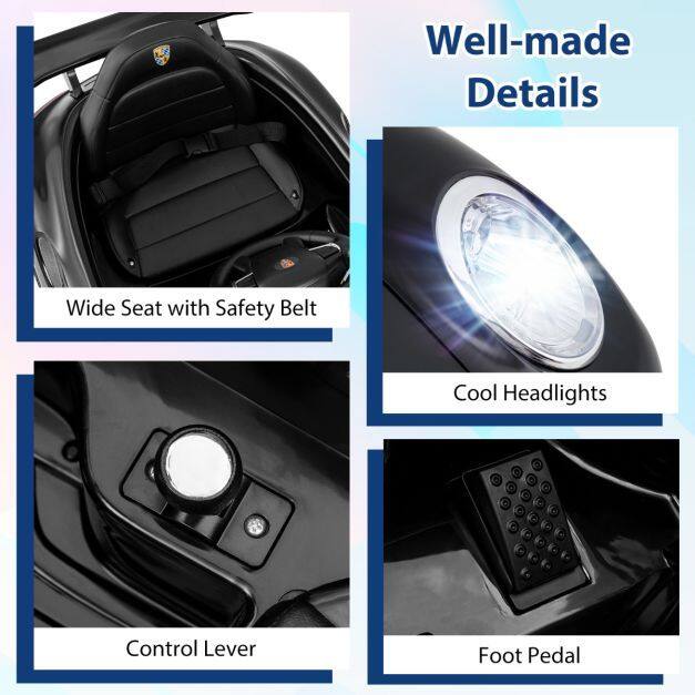 Officially Licensed by Porsche: This kids ride on car is officially licensed by Porsche and has powerful 12V battery and motors that enable long-lasting driving experience. Featuring a wide seat with safety belt, the electric car is safe and comfortable as well.