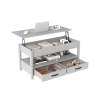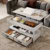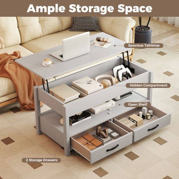 Ample storage space: The living room table is thoughtfully designed with optimal storage solutions. A large, hidden compartment under the tabletop offers discreet space for remote controls, magazines, and other living room items, while a spacious open shelf and two drawers ensure simple and stylish organization.