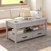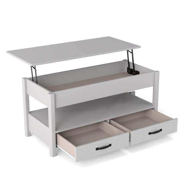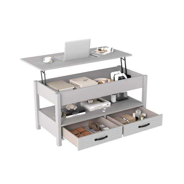 Transform your living space with our versatile coffee table that enhances both your room and your comfort. Featuring a seamlessly adjustable tabletop supported by high-quality gas springs, it transforms in an instant from a stylish coffee table to an efficient workspace. This country-style accent table impresses not only with its appearance but also with its storage capacity, including a hidden compartment, ample surface area, and two drawers for neatly and discreetly storing your essentials. Crafted for everyday use, it boasts a robust construction and safe, rounded corners for added protection.