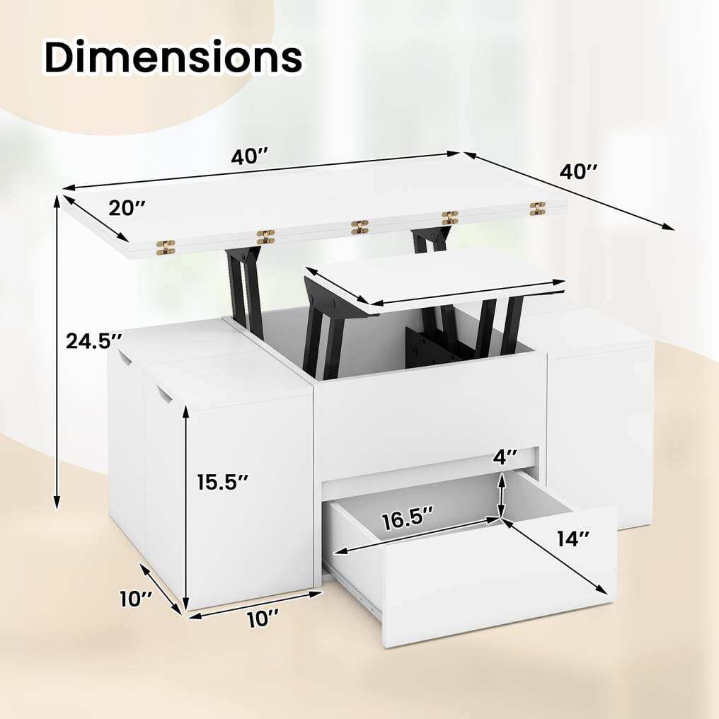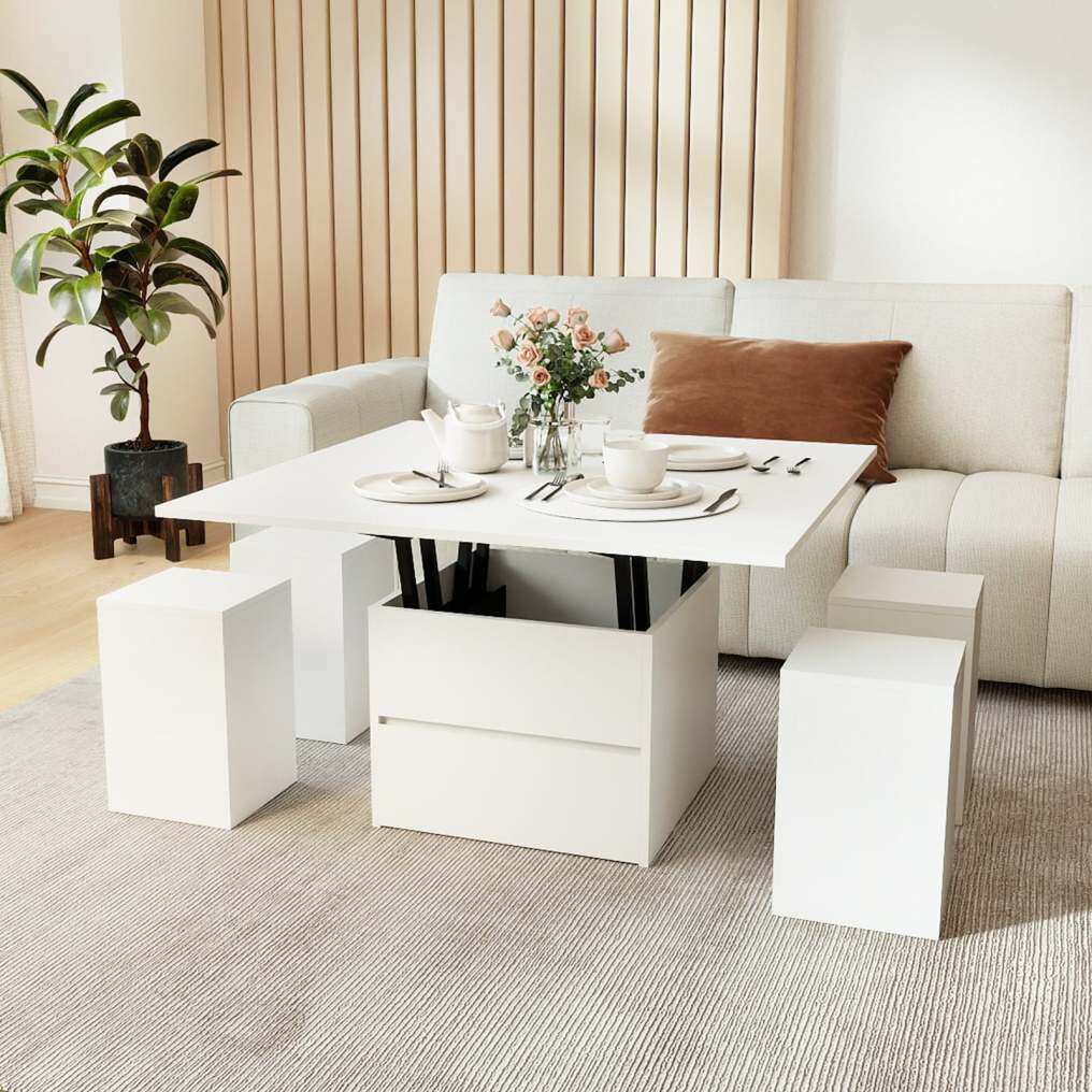 Lift Top Coffee Table with 4 Storage Stools and Hidden Compartment-White