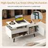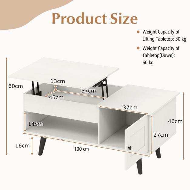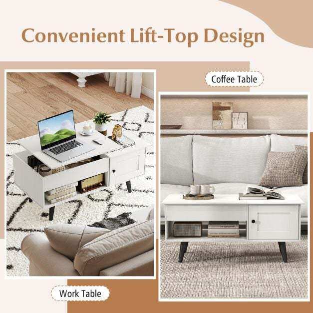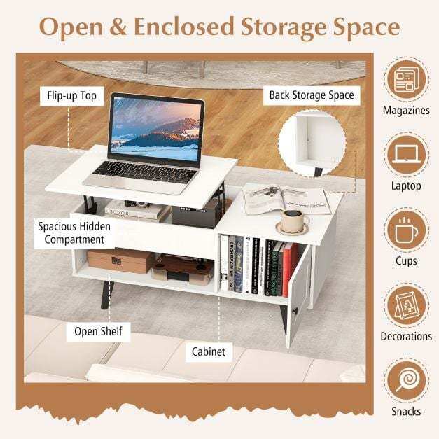 With a simple pull, the elevated work surface is provided to place your laptop or enjoy a meal comfortably from your sofa. Below the lift top, the hidden compartment awaits. An open shelf serves as the perfect spot for decorative items and storage box. Additionally, the side cabinet offers discrete storage for those items you prefer tucked away, maintaining a neat and tidy area. Its sturdy structure leaves you no worry about load bearing capacity and using reliability. This flip-top coffee table evolves into an indispensable piece of furniture in your home.