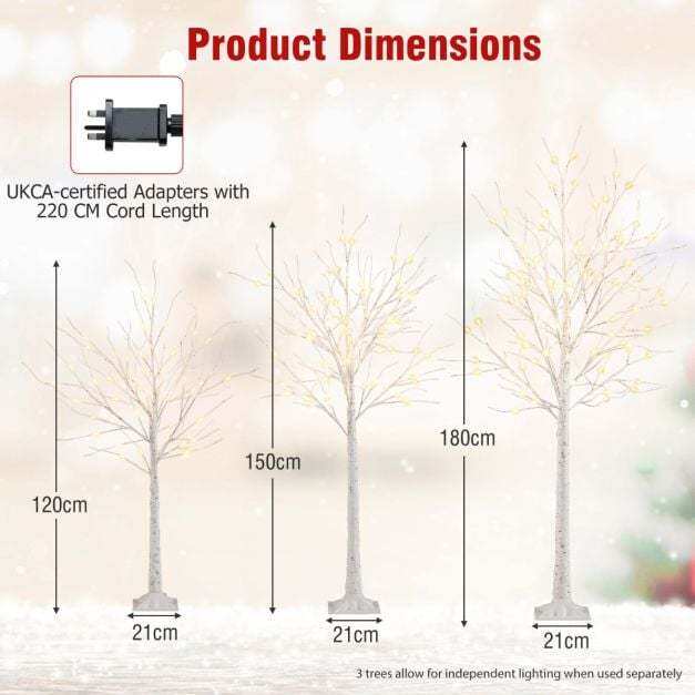 Warm White LED Lights: Immerse your space in the cozy glow of 96, 72, and 48 pre-lit warm white LED lights, creating a magical ambiance for your celebrations. The birch Xmas tree set comes with UKCA certified adapters for ensured using safety.